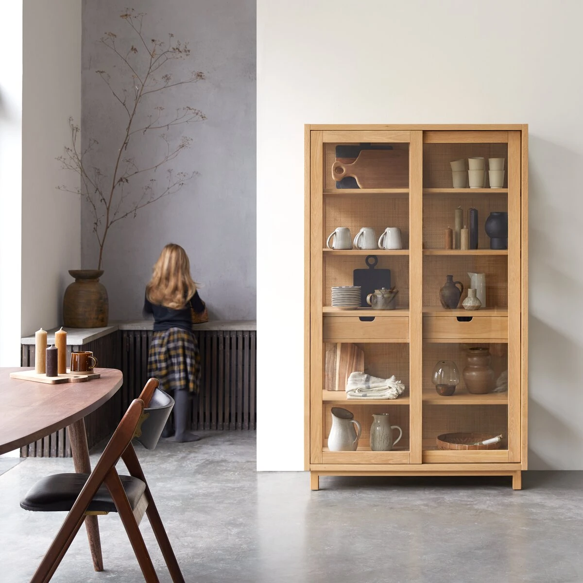 Élégante sobriété et détails raffinés : le vaisselier en chêne massif Adel est idéal pour sublimer votre vaisselle ou vos jolis objets déco. On aime la pureté de sa ligne, la blondeur de son bois qui autorise de nombreuses associations de style et ses finitions qui font entrer la nature dans la maison : le fond est recouvert d’un cannage en rotin pour conférer à l’ensemble douceur et naturel, une influence pile dans l’air du temps. A noter aussi les tiroirs bien pratiques pour accueillir les couverts, les serviettes ou tous ces petits objets qu’on ne veut pas voir traîner dans le séjour… et les portes coulissantes qui permettent de l’installer sans vous préoccuper de la place que prendront les portes ouvertes.
