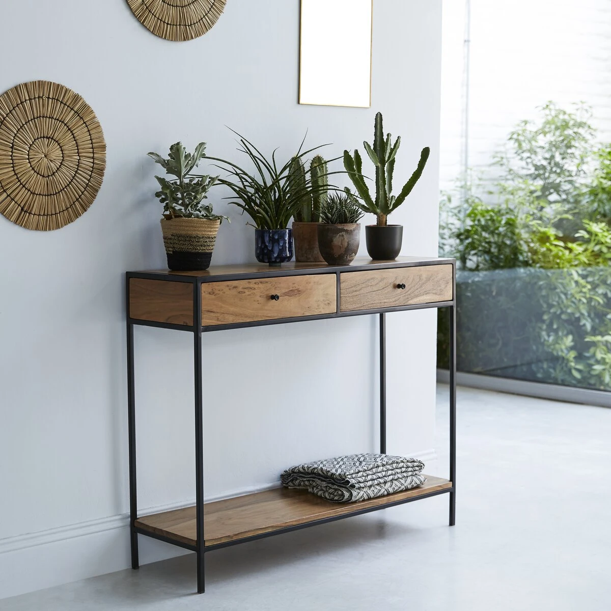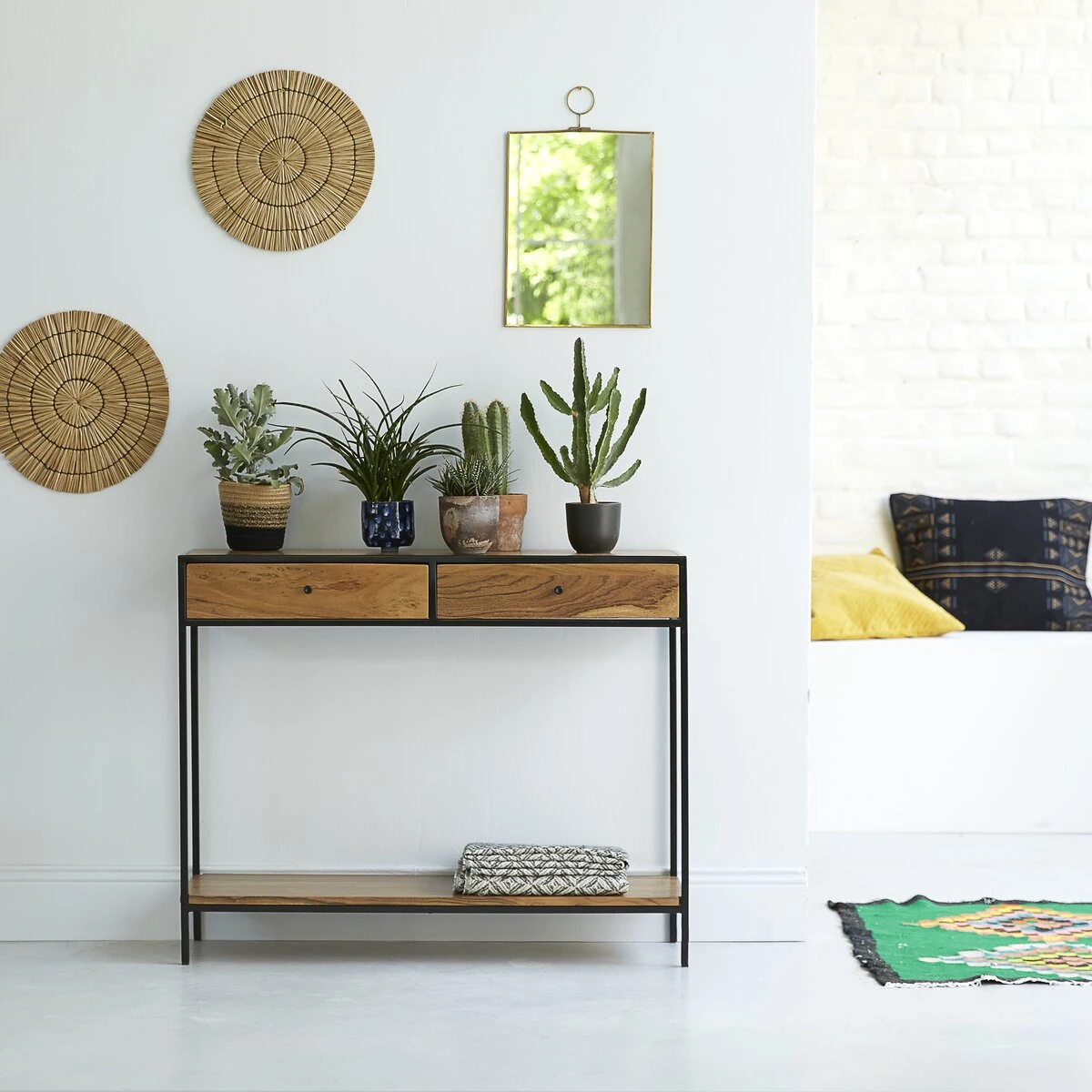 Directement inspiré des anciennes usines, ce petit meuble affiche sa belle sobriété au séjour, dans une entrée ou au salon… On place dans les tiroirs tous ces petits objets qu’on ne veut pas voir traîner mais qui nous sont pourtant indispensables au quotidien : les clés, le courrier, les stylos, le papier brouillon… Pour un effet déco encore plus réussi, vous pouvez, comme sur notre photo, y placer différentes variétés de plantes ou des objets déco, des cadres photos… Vous pouvez aussi lui dédier un rôle plus pratique et la transformer en petit bureau écritoire. Quel que soit l’usage que vous en ferez, la console en métal et acacia Agra conférera à votre intérieur un petit air vintage très apprécié dans la déco d’aujourd’hui.