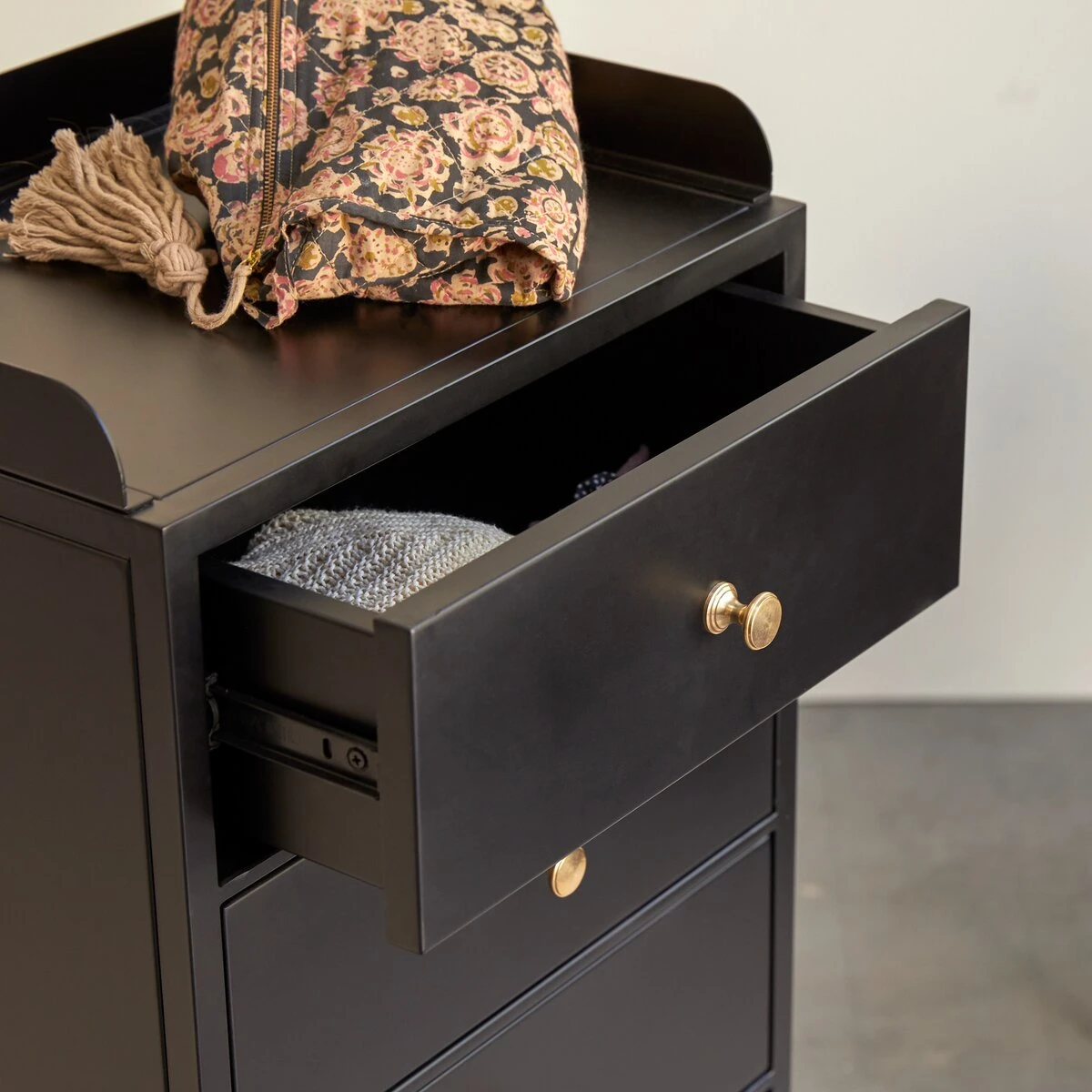 Petite info pour les parents : d’inspiration industrielle, la commode en métal 5 tiroirs Anika se marie avec beaucoup de talent aux meubles de nos collections Atelier.
