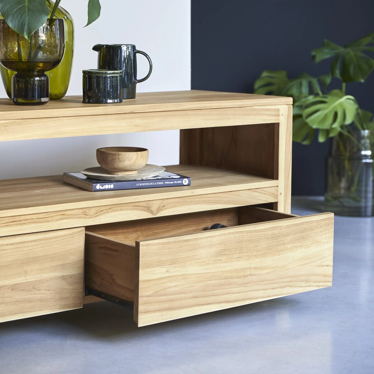 Ce meuble TV en teck 140 Anoa est composé de 2 grands tiroirs et d’une niche ouverte.
