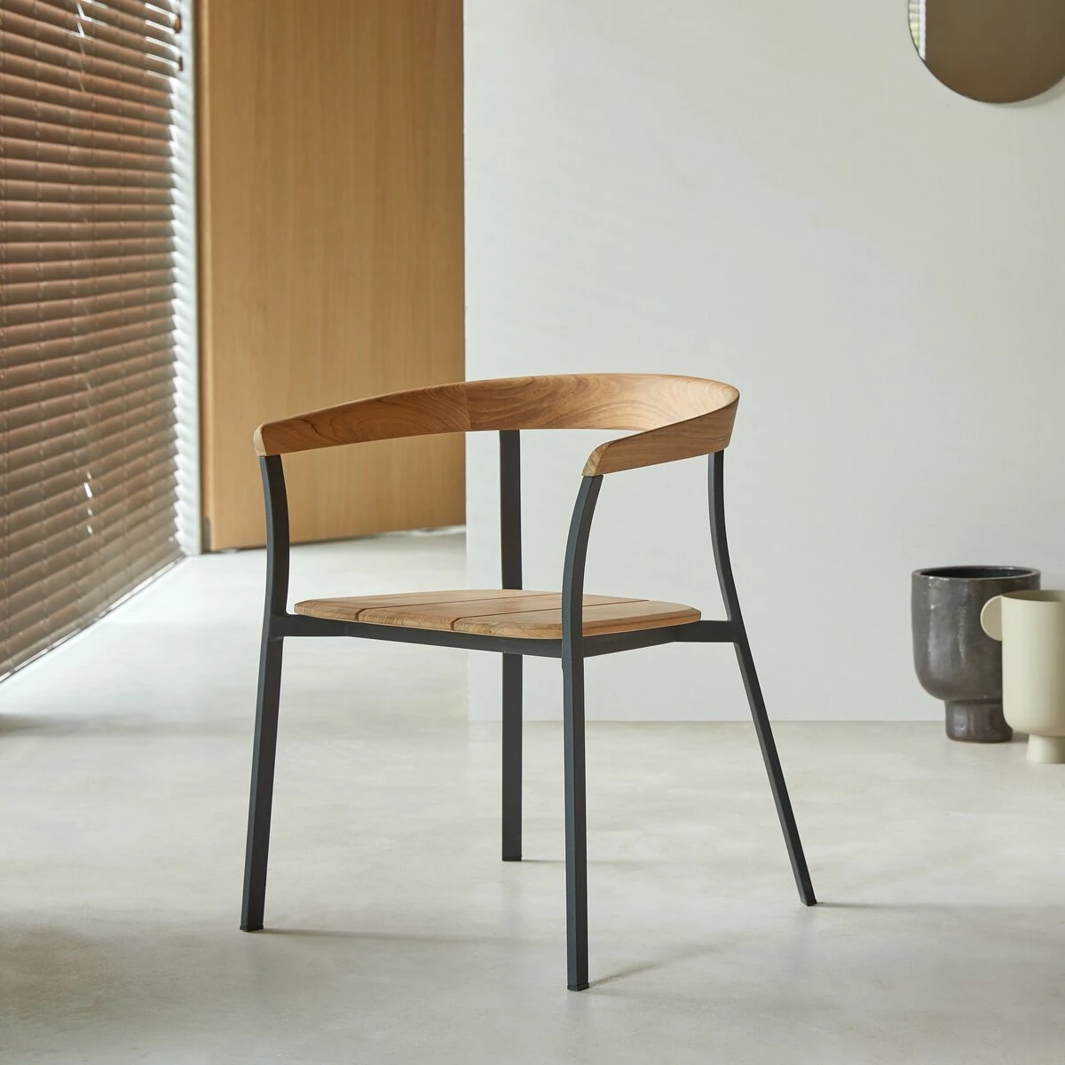 TechnicitĂ© et bois noble en accord parfait : la chaise en teck massif et aluminium Arco, un meuble haut de gamme au design trĂšs rĂ©ussi ! On aime lâarrondi du dossier obtenu par cintrage du bois – une rĂ©alisation technique qualitative – lâapport de lâaluminium qui sâoppose au bois sans lâaffronter et la ligne minimaliste. ĂpurĂ©e, cette chaise offre un Ă©lĂ©gant design contemporain quâon marie avec brio Ă la table en teck massif Paloma, version ronde ou ovale ou avec votre table : la blondeur de son essence autorise de nombreuses associations.