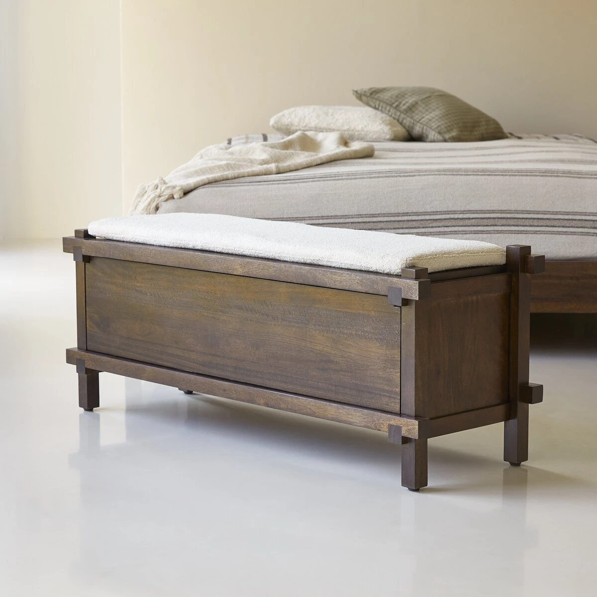Charme exotique et reflets nuancés du plus bel effet pour le bout de lit Arko en manguier massif. Ce meuble aux accents exotiques, complète avec réussite le lit Arko et le chevet Arko pour dessiner une chambre à coucher qui invite au voyage… sans quitter la maison ! Idéal aussi au salon pour réveiller d’une touche ethnique la déco existante ou composer un univers complet inspiré d’horizons lointains, il devient meuble de rangement pour les chaussures dans une entrée spacieuse ou le vestiaire : bien pratique, son grand coussin pour se chausser assis ! Le manguier massif est verni pour être facile à vivre au quotidien.
