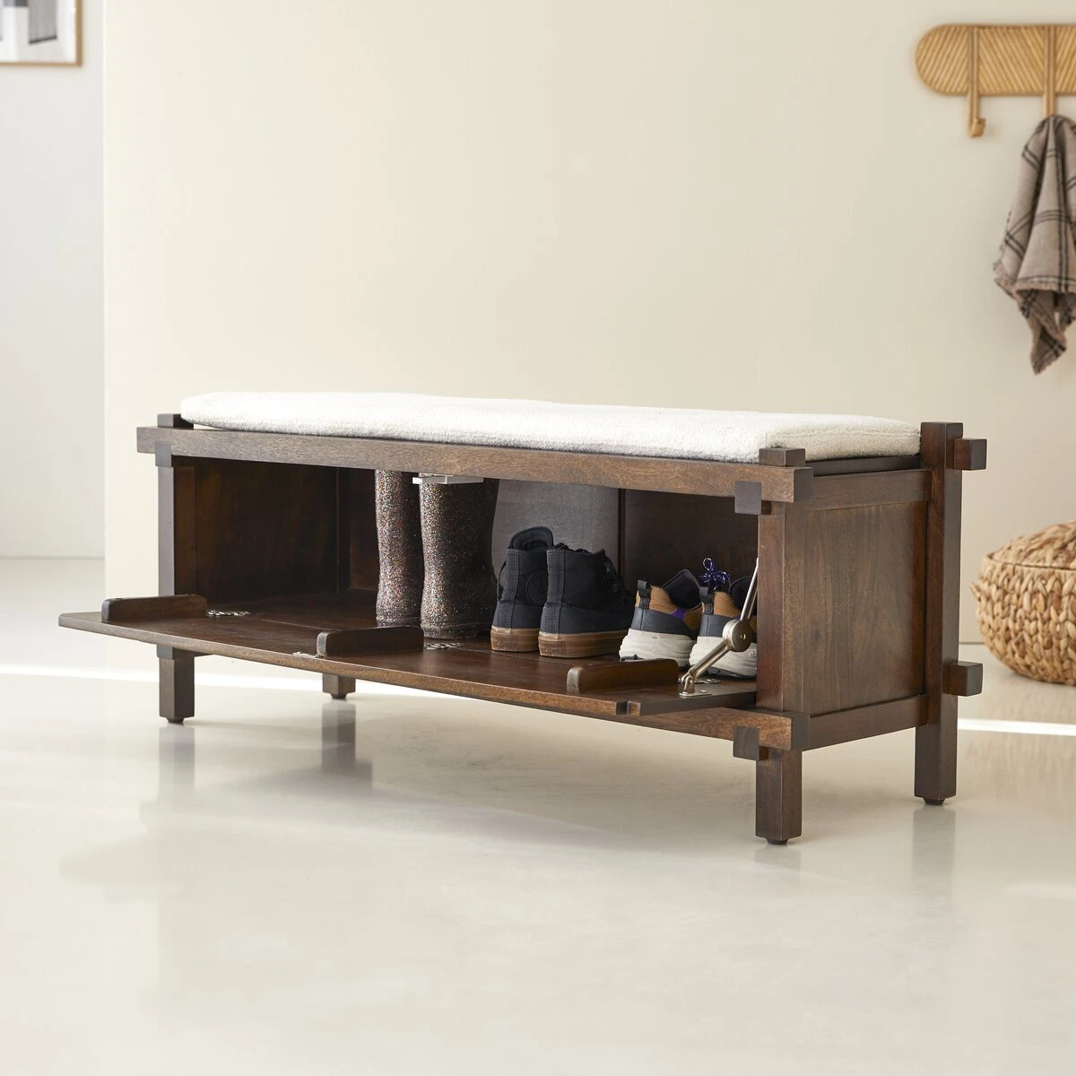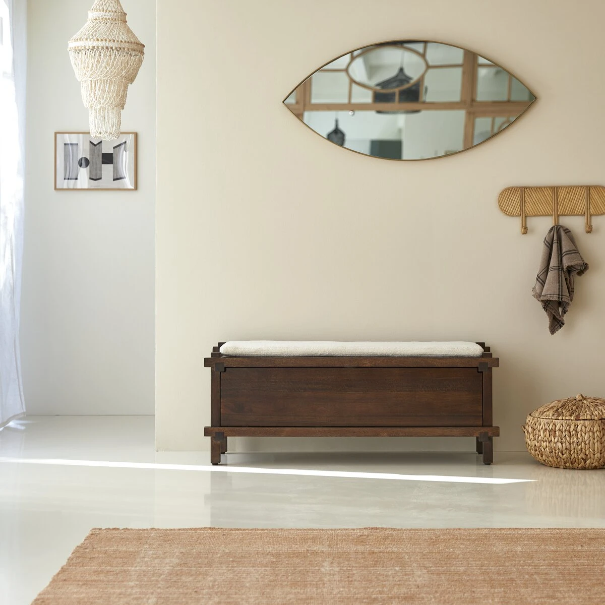 Un charme venu d’ailleurs pour un élément d’ameublement pratique et astucieux… le meuble à chaussures Arko en manguier massif, permet de se chausser et de se déchausser confortablement : il suffit de s’asseoir sur son coussin et de ranger ensuite les chaussures dans le logement prévu à cet effet. Idéal dans une entrée ou le vestiaire, il peut également se placer en bout de lit. Il permettra alors de ranger aussi le linge de lit ou des éléments qu’on ne veut pas voir trainer dans la chambre à coucher.