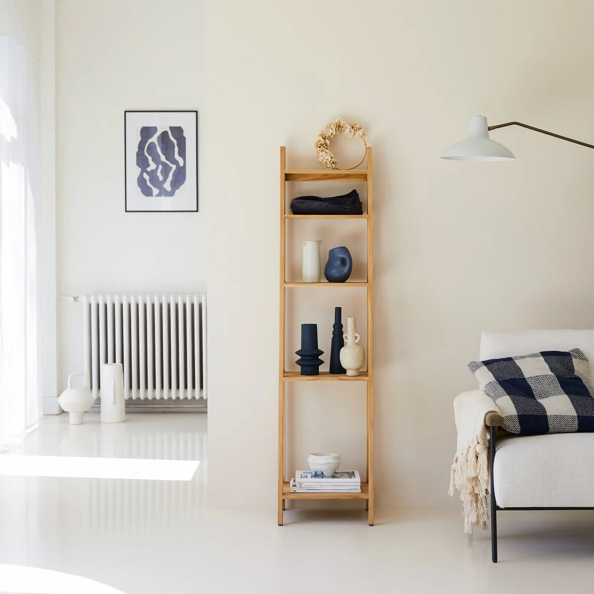 Cette petite étagère en teck brut apportera à votre pièce une note naturelle et tendance à la fois élégante et actuelle, elle est composée de 4 niveaux pour le rangement de vos livres et accessoires de décoration. Les lignes sobres et élégantes de ce meuble de rangement alliées à sa teinte claire s’adapteront à tous les intérieurs. Vous aimerez la diversité des dimensions utiles, pour une organisation variée et à votre image.