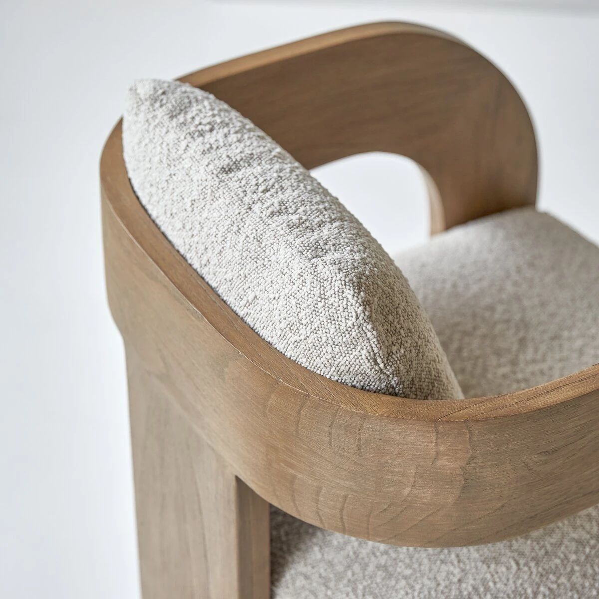 Pièce graphique et de caractère, la chaise Boti en mindi massif et tissu bouclé est déclinée dans une version fauteuil Boti.
