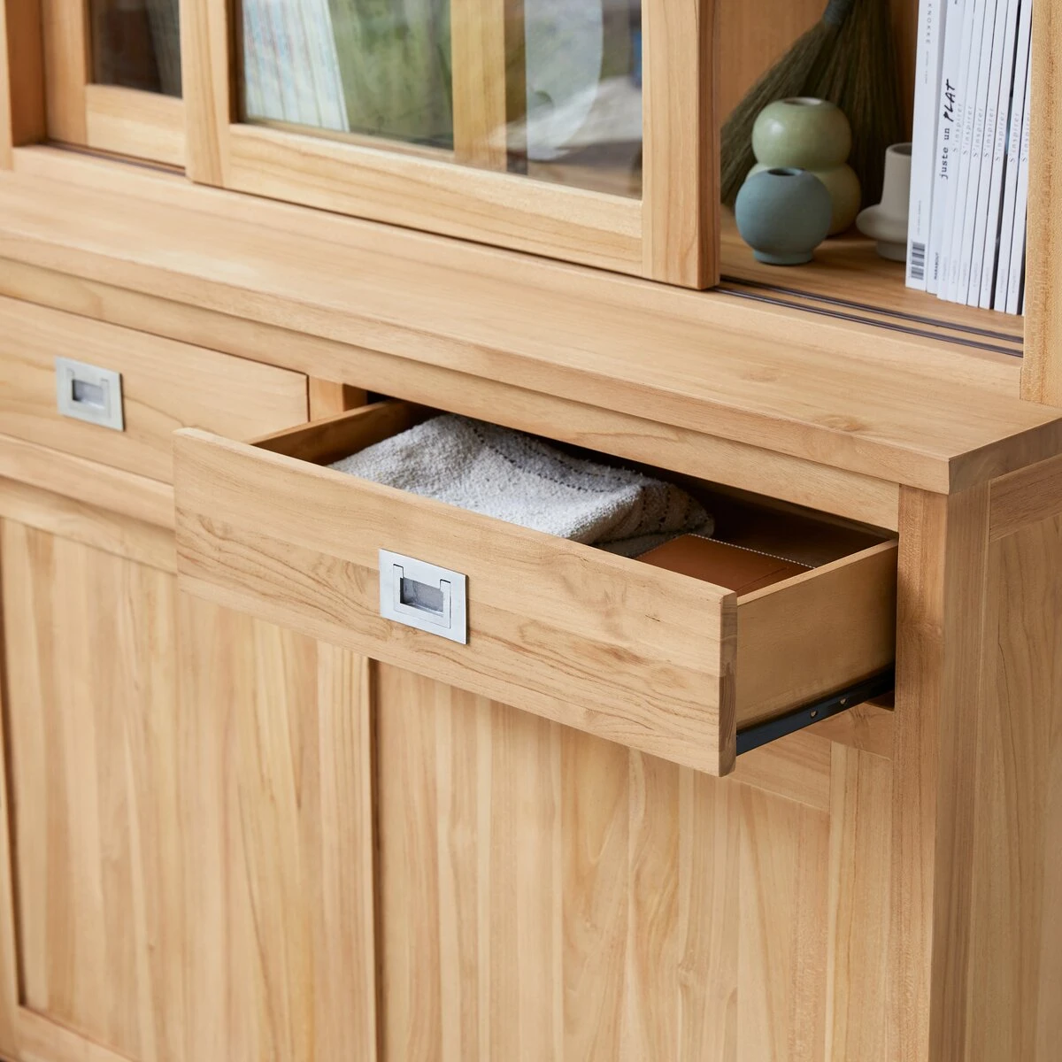Découvrez notre vaisselier Coffee tek slide en en teck massif certifié FSCŸ. Il est équipé de portes coulissantes ouvrant sur de nombreuses possibilités de rangement. Parfait pour le séjour ou la cuisine, notre meuble buffet vous permettra de mettre à disposition votre vaisselle, votre linge de maison ou de mettre en valeur vos éléments de décoration derriÚre la partie vitrée.