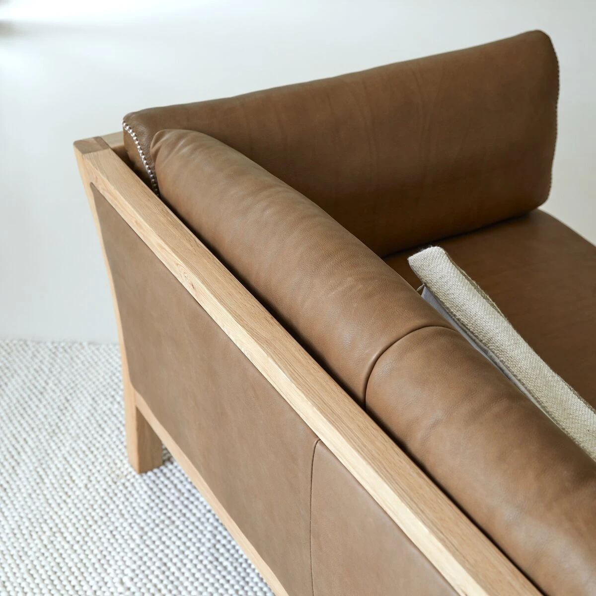 Le cuir cheyenne de très belle qualité offre des coutures apparentes contrastées très remarquées, le piétement en chêne massif brut dessine des lignes sobres et plutôt contemporaines…