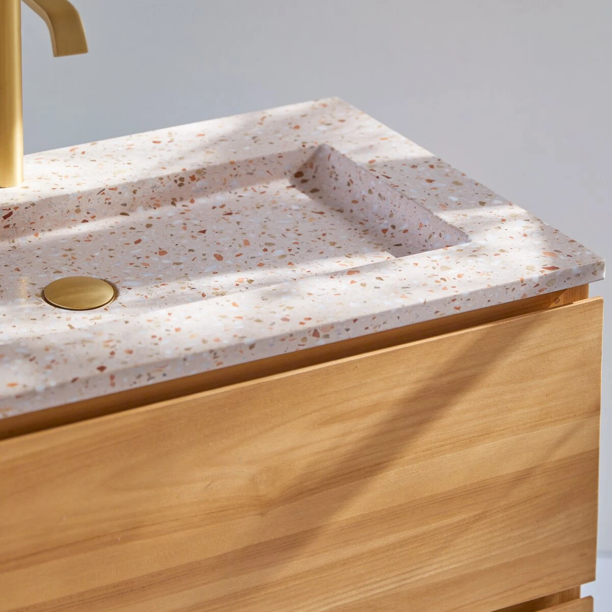 Le meuble de salle de bain Edgar en teck massif et terrazzo premium pink conjugue la perfection de deux matières haut de gamme et l’élégance intemporelle d’un design tout en sobriété. Travaillé dans un bois massif dont les qualités de résistance à l’humidité et au temps ne sont plus à démontrer, il est équipé d’une longue vasque en terrazzo premium, cette incroyable matière composée à 80% de marbre et à 20% d’un liant sans résine.