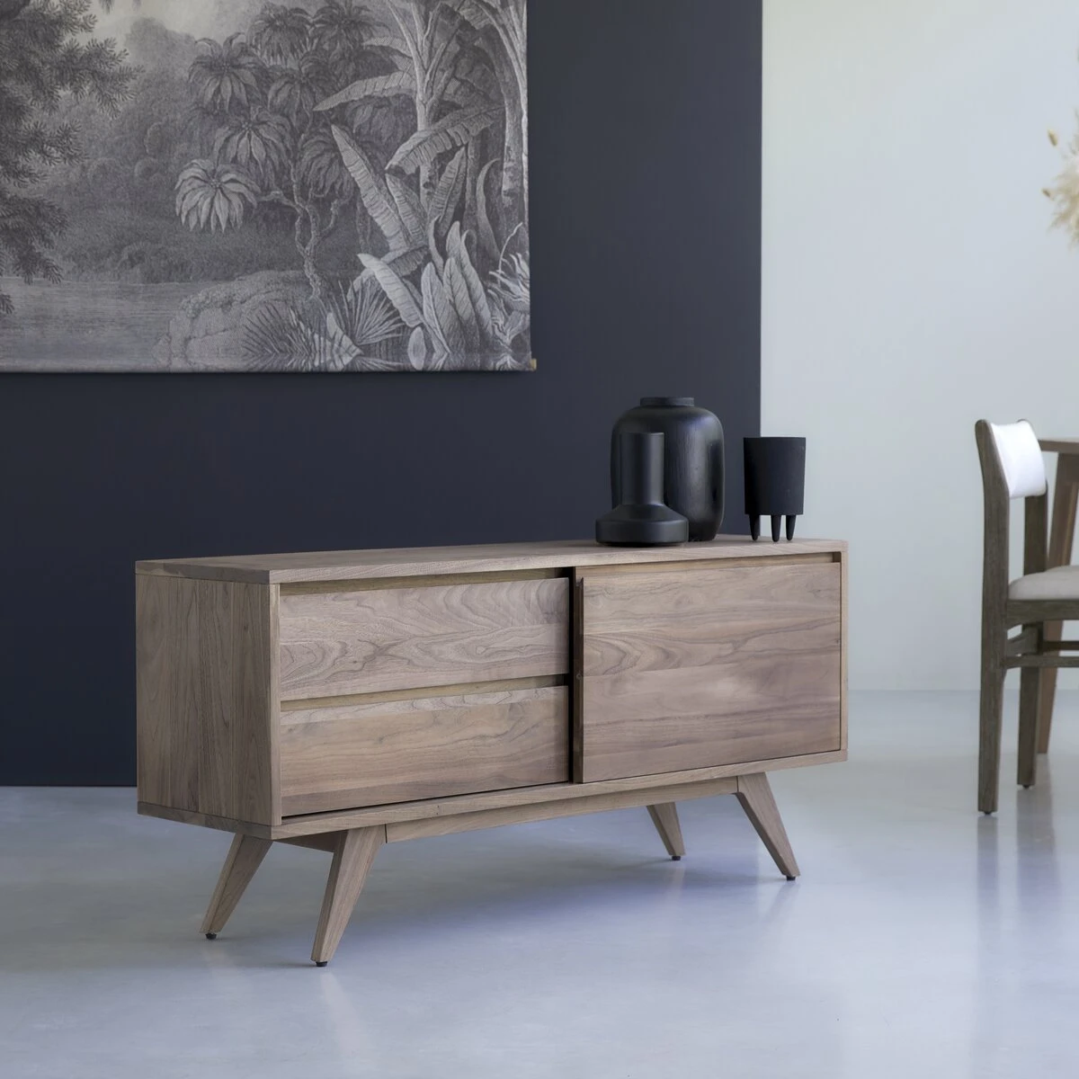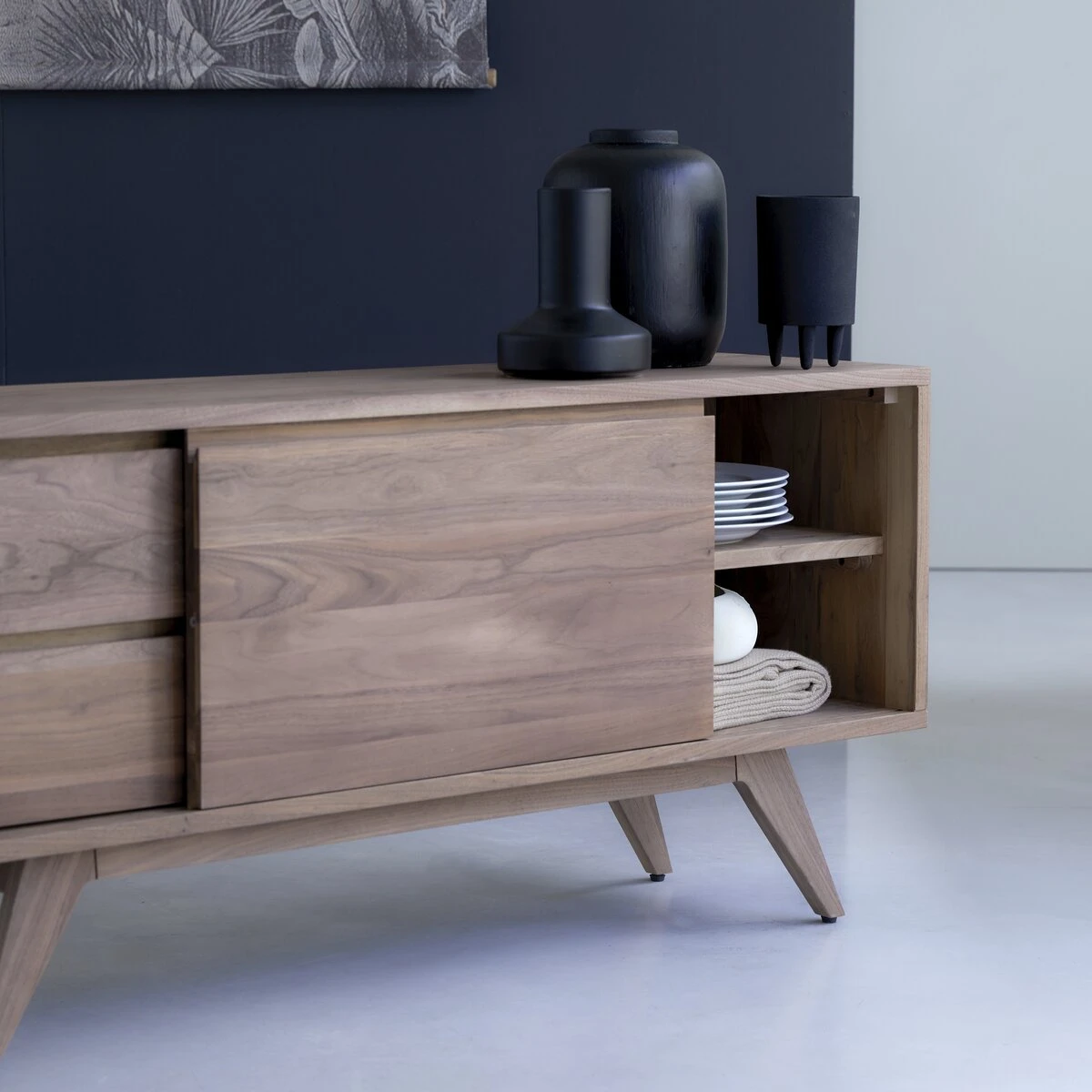Le buffet en noyer massif Esmée trouve tout naturellement sa place dans le séjour ou la cuisine et offre de nombreux atouts : travaillé dans un bois noble aux reflets mordorés et au veinage apparent, il accueille la vaisselle et le linge de maison avec générosité. On aime la porte coulissante très pratique et les deux tiroirs, parfaits pour ranger tout ce qu’on ne veut pas voir traîner dans le séjour.