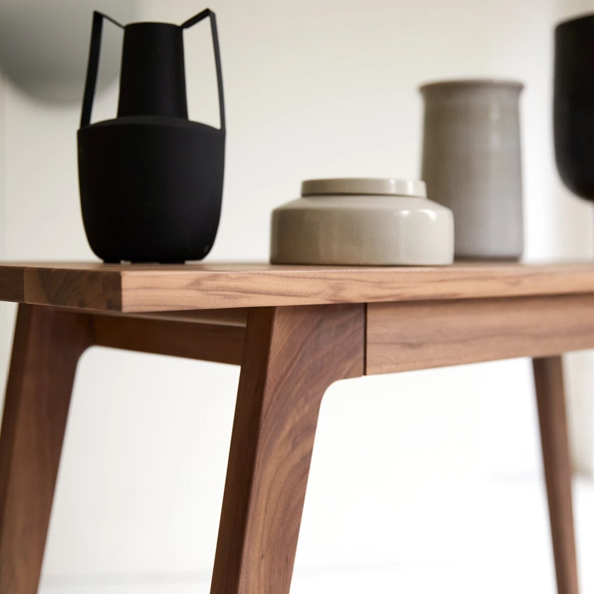 Pureté de lignes et esprit scandinave pour la console en noyer massif certifié FSC® Esmée. On aime l’élégance intemporelle de son bois aux nervures apparentes du plus bel effet, conjuguée à un design tout en sobriété. Une console joue souvent le rôle d’espace d’exposition : celle-ci trouve naturellement sa place dans chacune des pièces de la maison. Dans l’entrée, elle accueille les visiteurs et permet de poser sacs, clés et autres objets du quotidien, dans le salon, elle sublime vos plantes vertes, bouquets ou objets design, dans le séjour, elle fait office de desserte… Idéale aussi pour habiller une cloison un peu minimaliste, servir de petite bibliothèque ou exposer une collection.