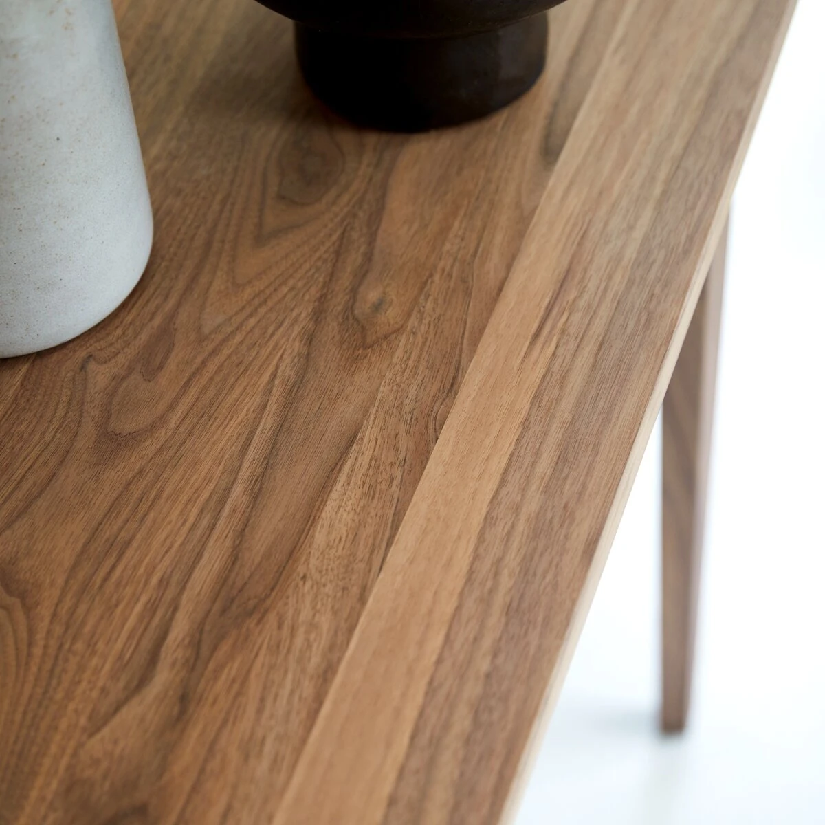 La console en noyer massif Esmée vous est livrée déjà huilée pour être facile à vivre au quotidien. Son bois FSC® est issu de forêts durablement gérées. Elle appartient à notre collection Esmée, travaillée dans un bois noble aux reflets mordorés. N’hésitez pas à la combiner avec des pièces de notre gamme de meubles à l’esprit Scandinave.