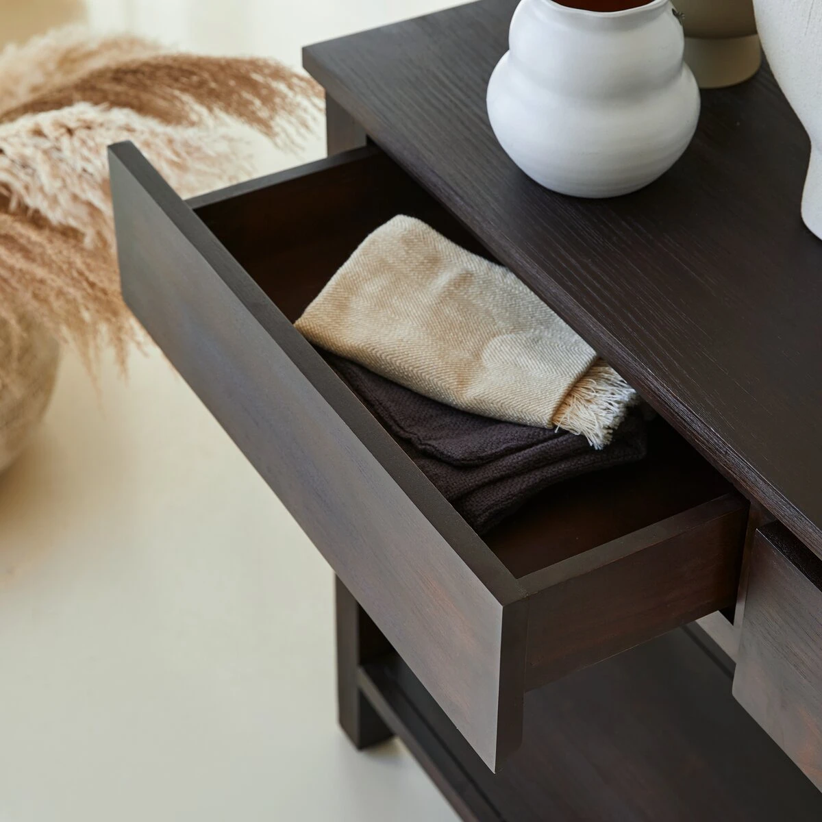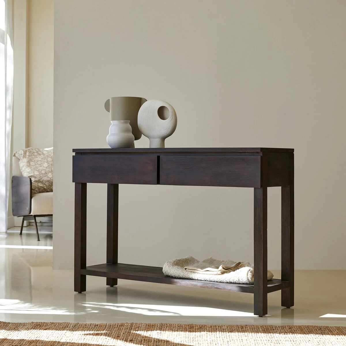 La console wengĂ© en acajou massif certifiĂ© FSCÂź 120 Eva Biti trouve sa place partout dans la maison ! Au sĂ©jour, au salon, dans lâentrĂ©e ou le bureau⊠on y place objets de dĂ©co, plantes ou livres.