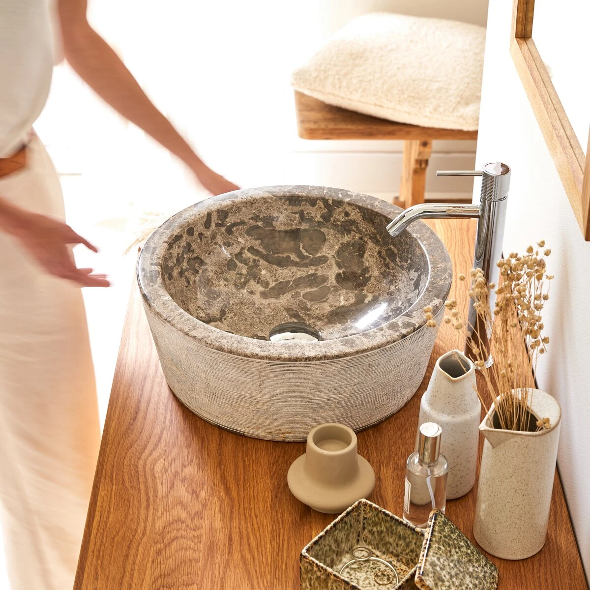 Taillé dans un marbre provenant de différents gisements, la vasque en marbre Exo Stri grey peut visuellement différer très légèrement de notre visuel, fluctuant du gris au brun.