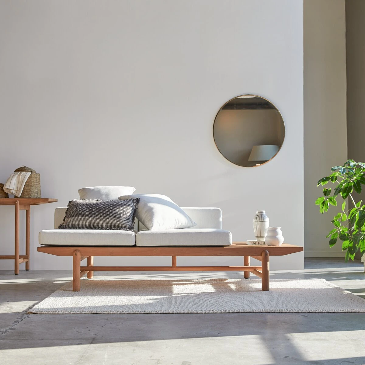 Quand l’esprit outdoor s’invite au salon : la banquette 2 places en teck massif Fado crée une atmosphère de jardin d’hiver ! Meuble haut de gamme, elle offre des prestations de qualité : son plan latté (très apprécié en termes de design contemporain) est travaillé avec le plus grand soin, ses coussins sont déhoussables et lavables en machine, son bois verni est réputé pour ses qualités de résistance aux petits accidents du quotidien, à l’usure et aux intempéries et la visserie est en laiton. C’est un meuble premium qui s’attache à créer un univers propice à la relaxation et aux instants de convivialité. Modulable, à vous d’inventer la banquette que vous préférez : les coussins s’installent de multiples façons, selon vos envies ou vos besoins !