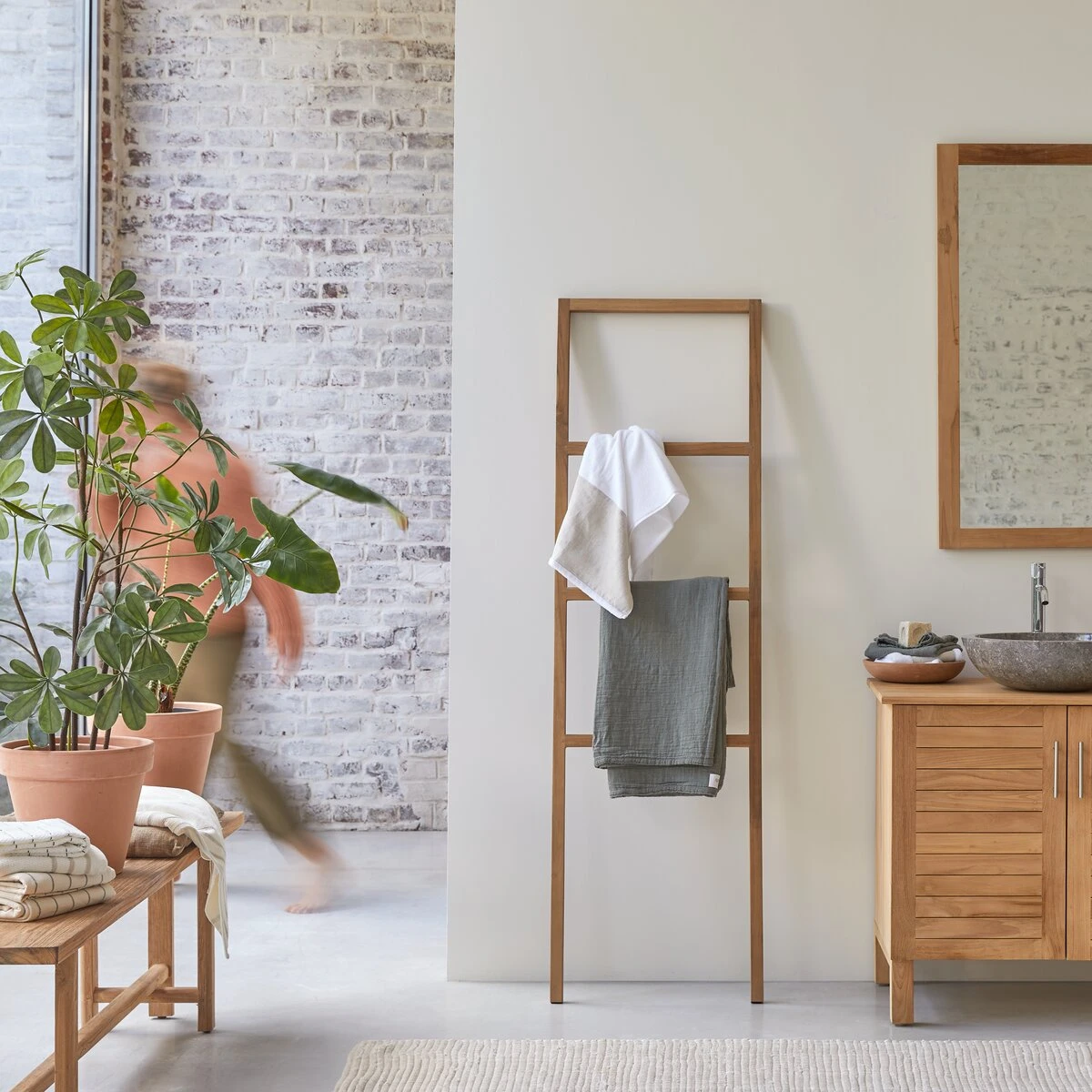 Ici, le modèle sur pied Galyno : pratique, cet accessoire en teck certifié FSC® est composé de 3 niveaux vous permettant d’y suspendre vos textiles.
