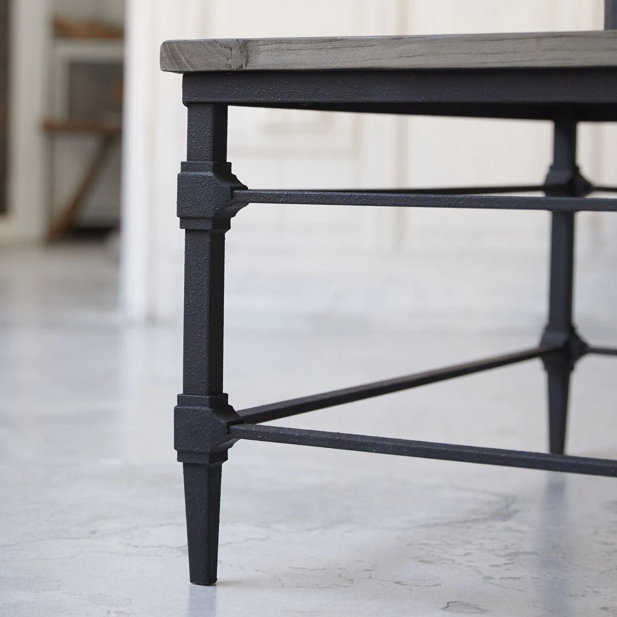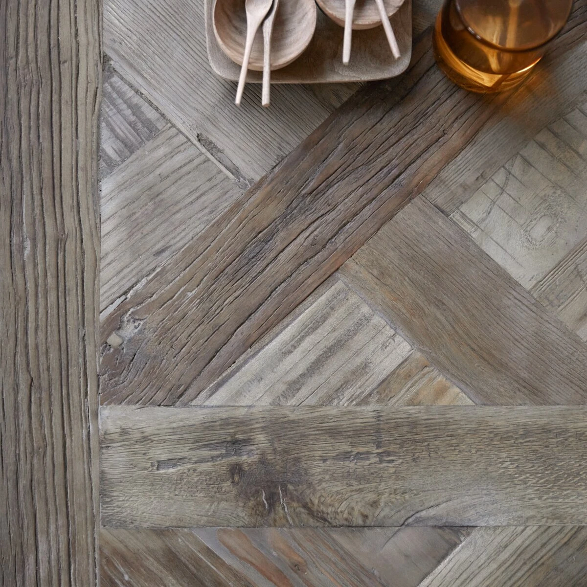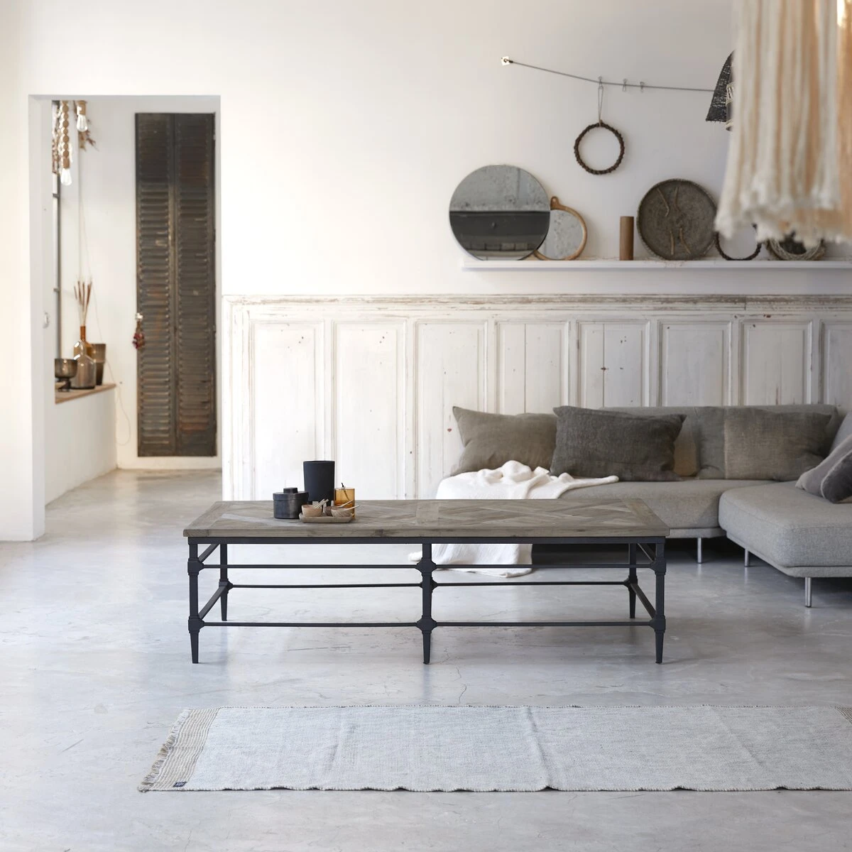 Vous apprécierez les lattes en orme massif recyclé disposées façon parquet ancien sur piètement métal. Le bois de cette table de salon, travaillé par le temps, laisse apparaître quelques imperfections signe d’authenticité.