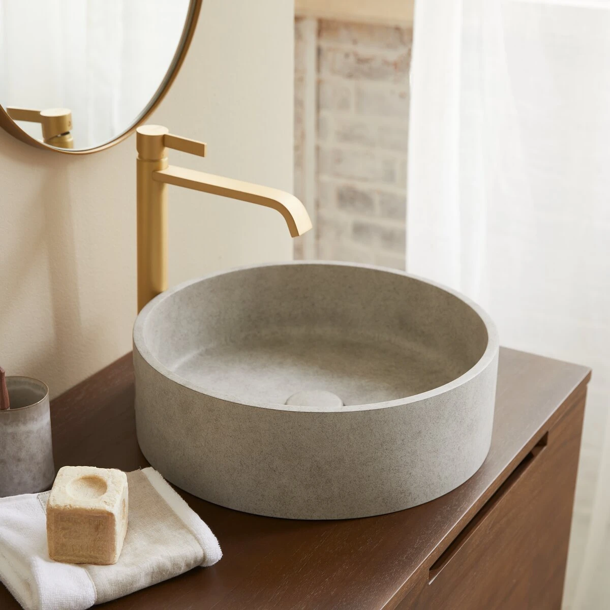 Son faux uni confère beaucoup de personnalité à la vasque ronde Gina en béton grey. Facile à vivre au quotidien, elle modernise la salle de bain par son design épuré et sa ligne tout en rondeur. Idéale sur un meuble en bois foncé, comme sur notre photo, l’élégance de son coloris autorise toutefois toutes les associations de couleur… Vernie pour la protéger, elle accompagnera votre vie jour après jour pendant de très longues années.
