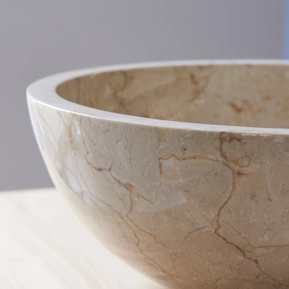 Charmante vasque en marbre de couleur crĂšme et finition lisse brillante.