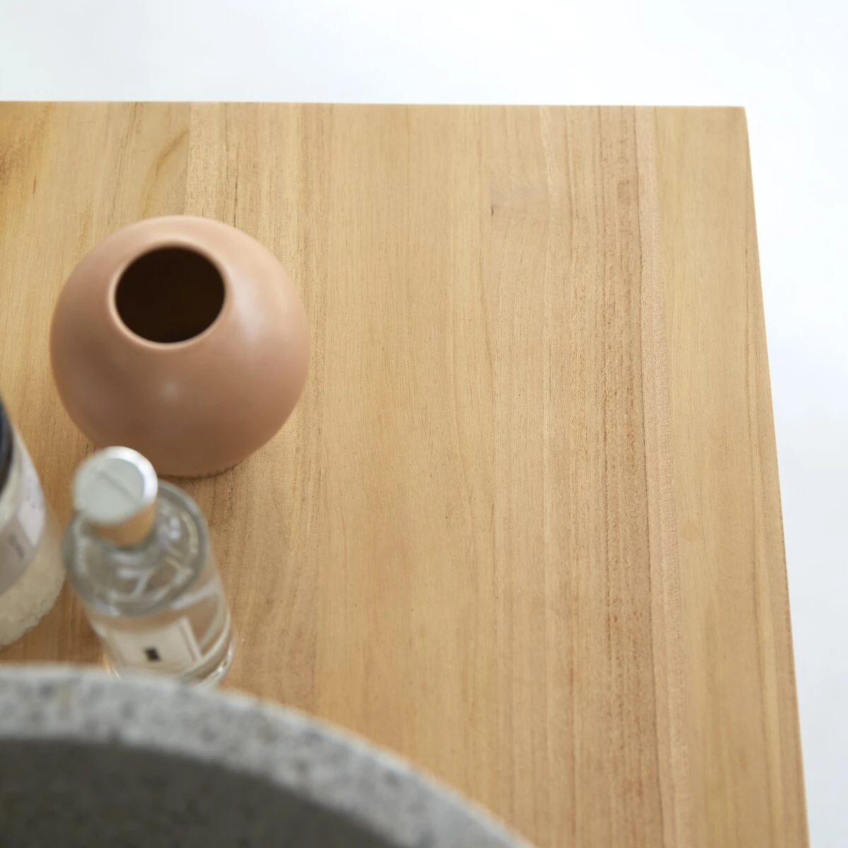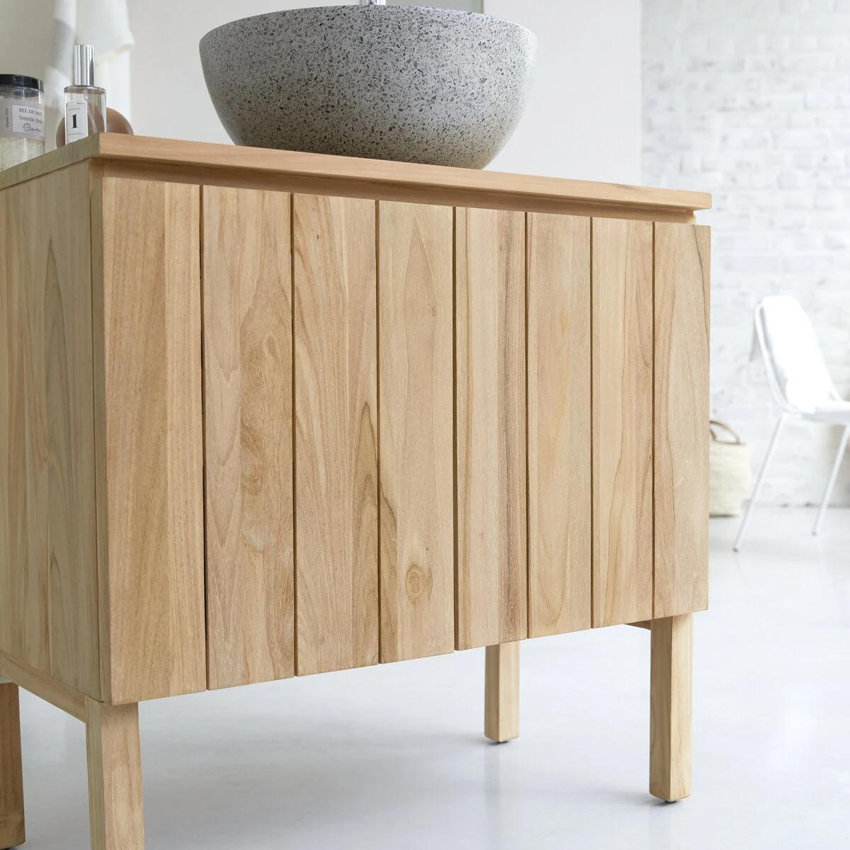 Hommage à la simplicité et au naturel avec le meuble de salle de bain en teck Jill. Travaillé dans un très beau bois massif certifié FSC®, il offre un design lamellé et un coloris clair, agréable à vivre au quotidien. Conçu pour recevoir une vasque à poser, il est ici présenté avec notre vasque en terrazzo Isa grey.