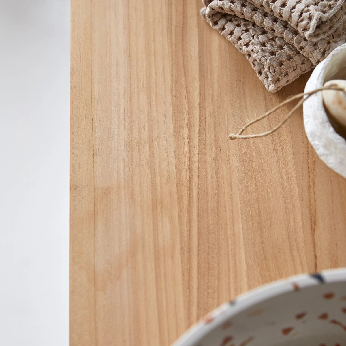 Le meuble de salle de bain en teck massif Jonak affiche un style scandinave esthétique, épuré et fonctionnel.