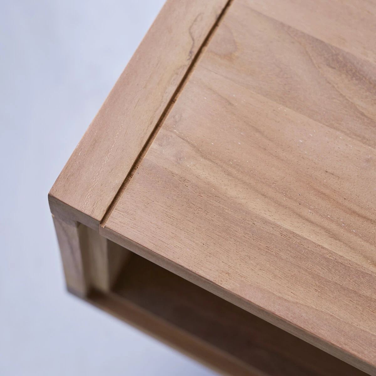 La table basse Jonàk est fabriquée en teck massif brut naturel. Véritable meuble de salon, sa niche vous permettra de ranger vos magazines et accessoires de décoration. Elle trouvera facilement sa place au salon comme dans une chambre d’amis, cette table de salon en teck apportera une touche originale à votre intérieur.