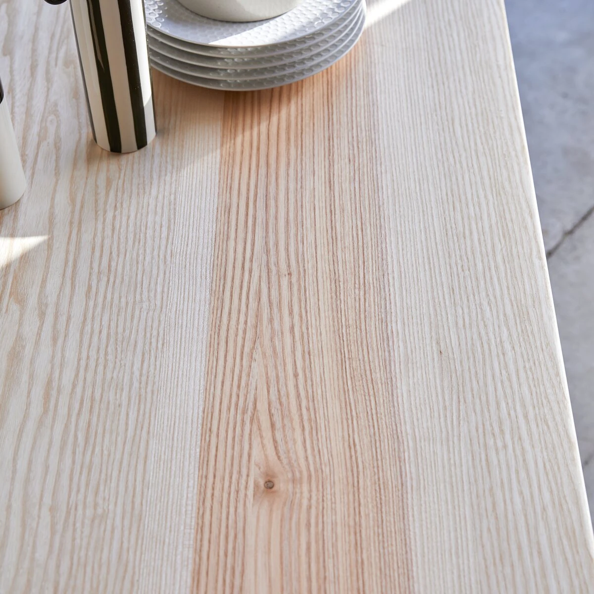 Idéale avec le banc en frêne olivier massif Josef, la table offre un piétement en fuseau légèrement incliné ce qui lui confère charme et élégance…