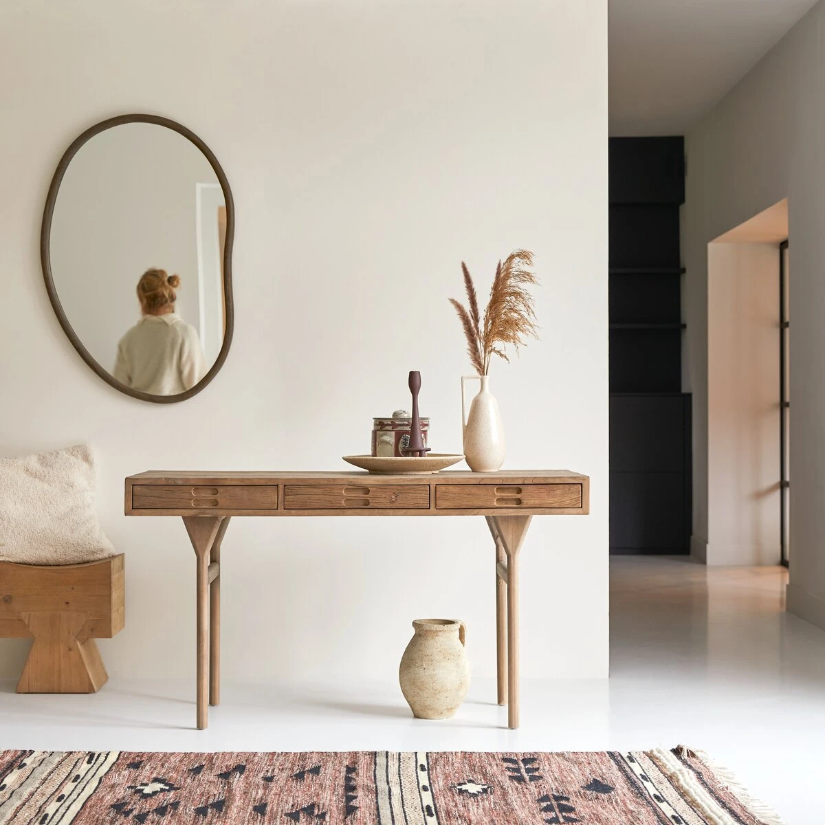 La console en pin et orme recyclés Kim met son design au service de vos plus jolis objets. Elle peut aussi se métamorphoser en un bureau aux lignes épurées. Les 3 tiroirs deviennent alors très pratiques ! Elle fait l’objet d’une finition vernie qui la protège sans masquer sa beauté.