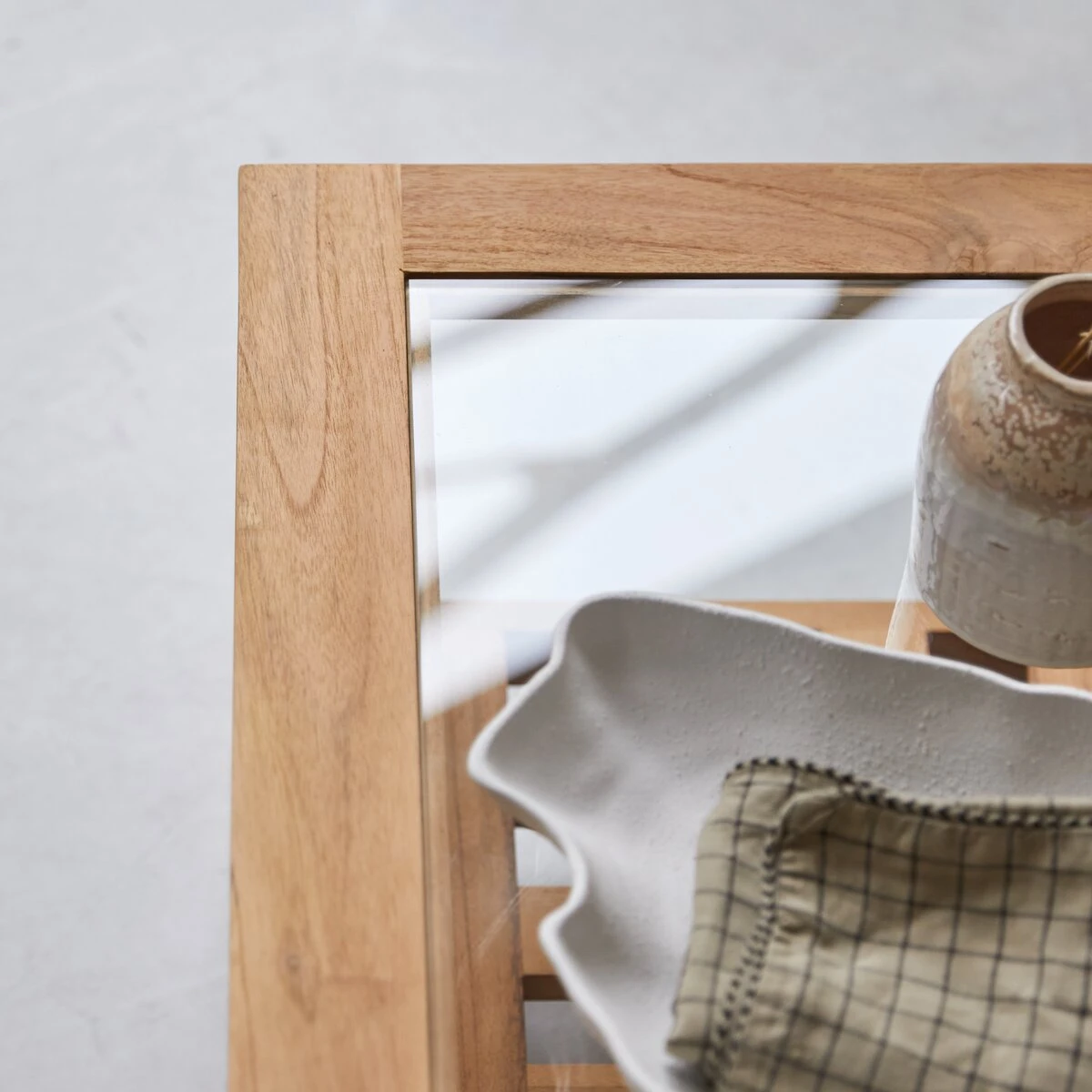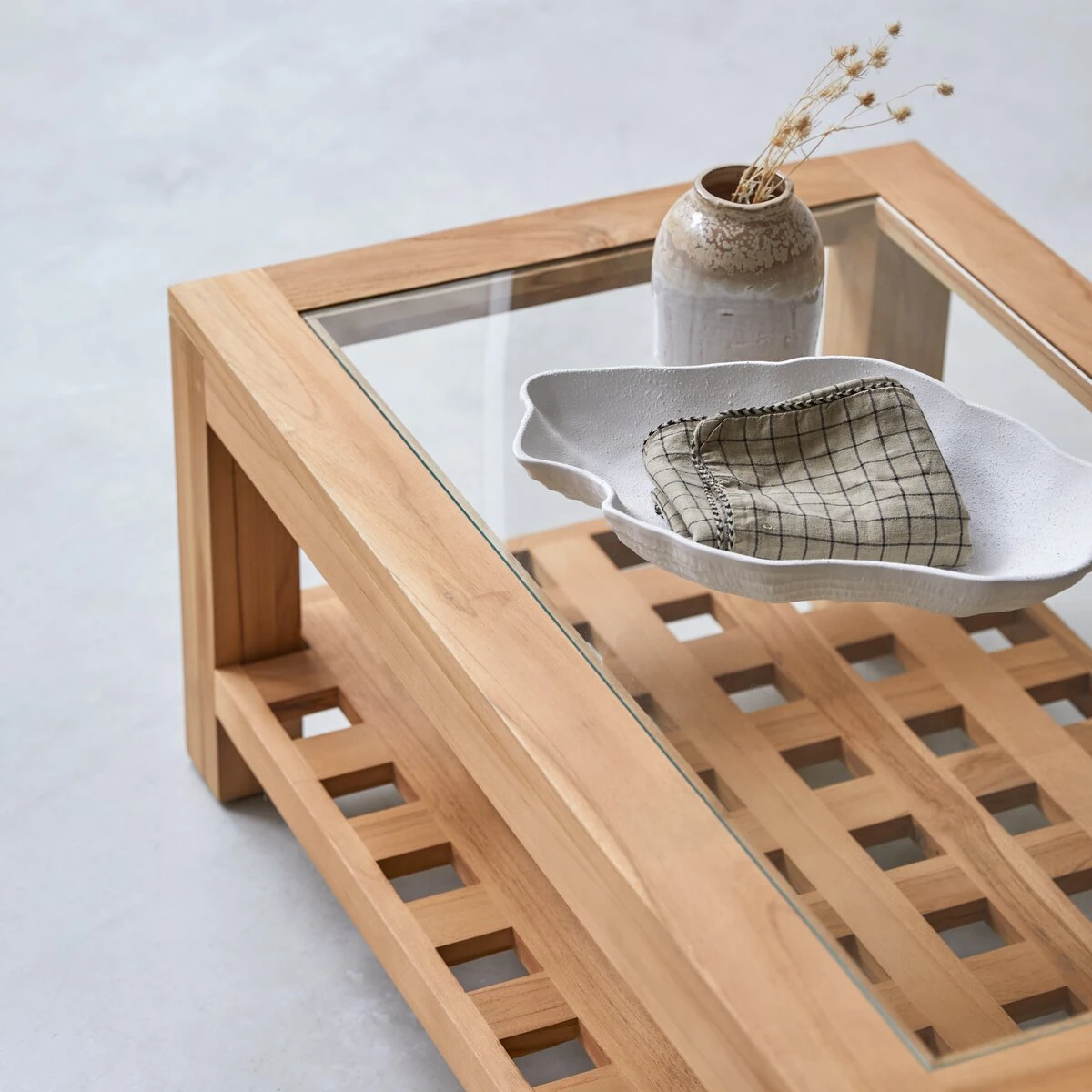 Table basse en teck massif certifié FSC® rectangulaire d’inspiration ethnique.