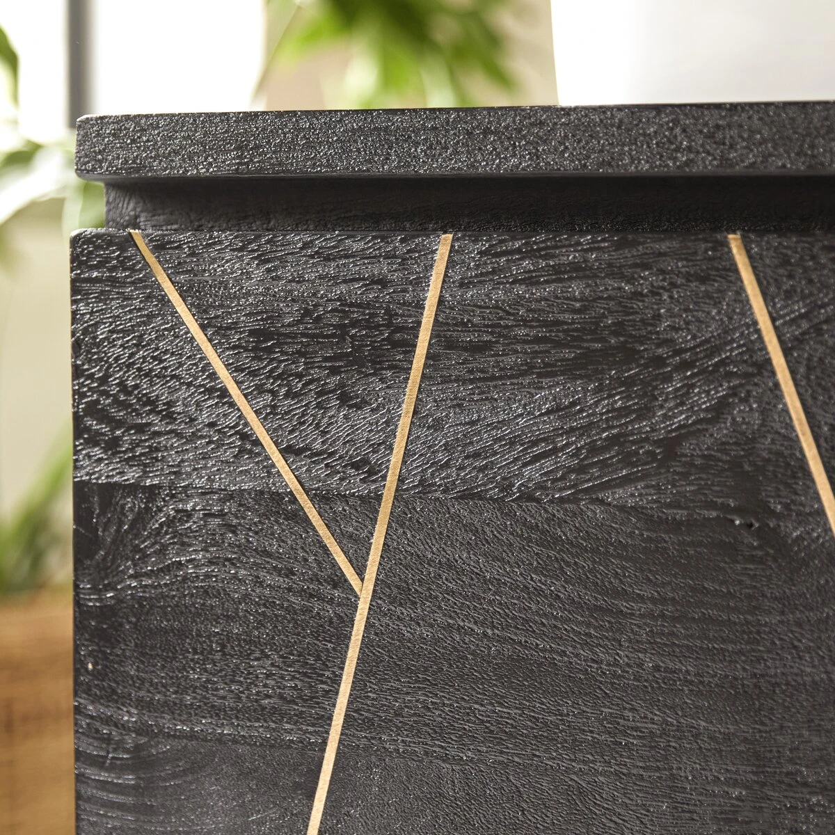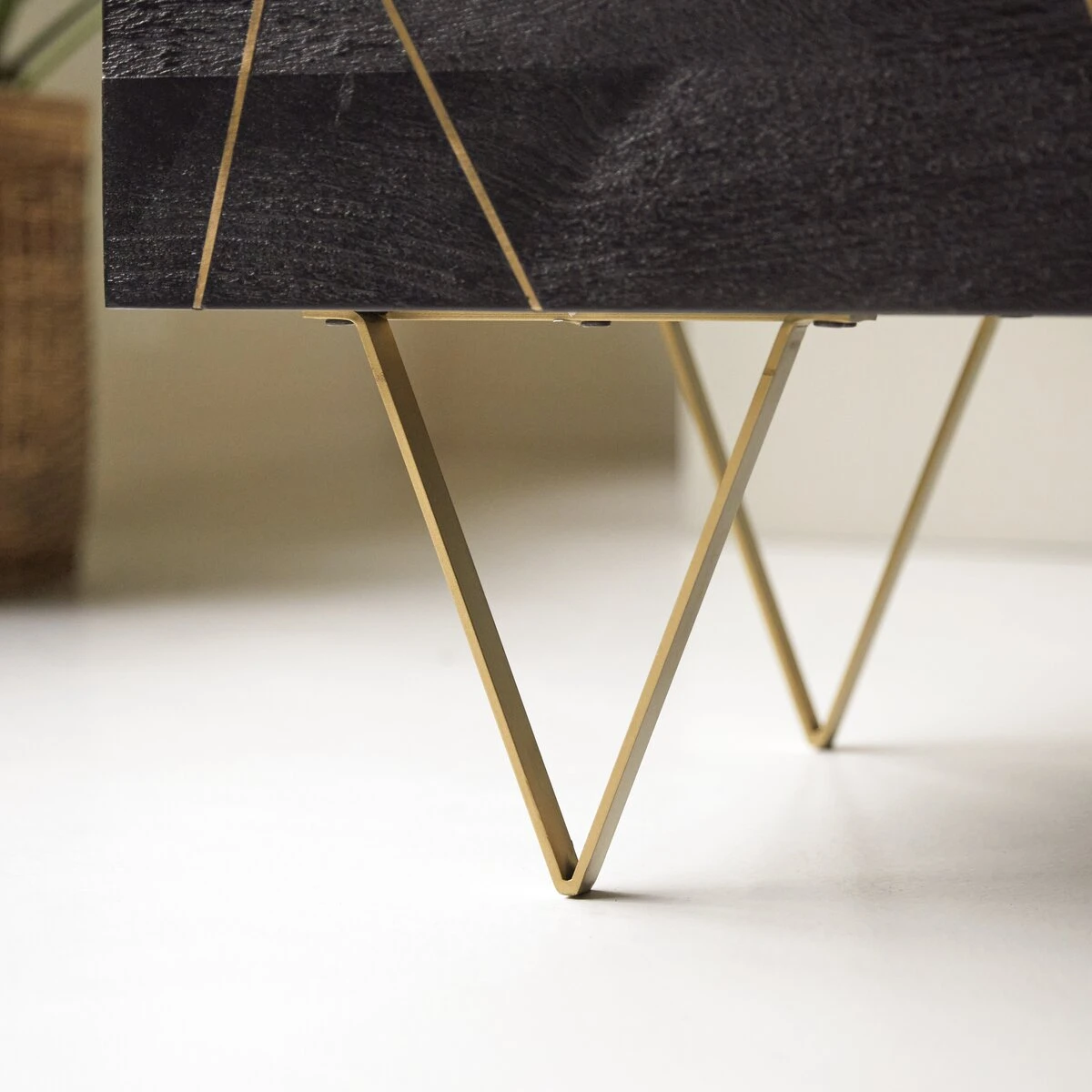Parce-que détente rime avec style nous vous proposons une gamme originale à la fois pratique et esthétique. Vous aimerez le contraste du bois massif de manguier coloré allié au dessin Art deco des façades ornées de métal couleur laiton. Ses pieds épingles en métal doré lui confÚre chic et élégance !