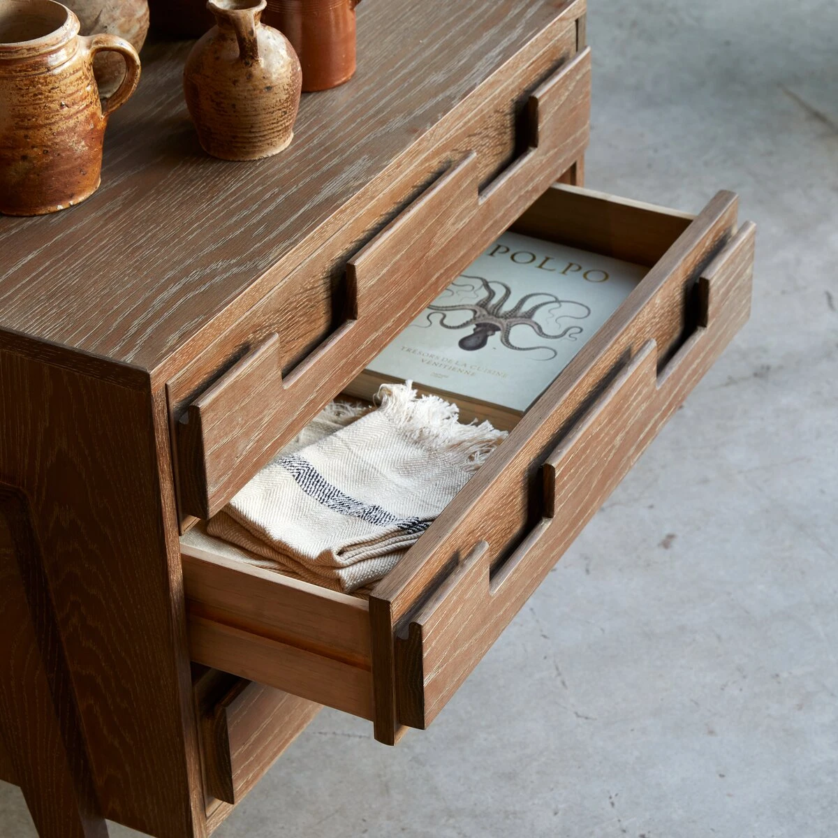 L’art de composer un intérieur tout en délicatesse… la commode en pin recyclé et chêne Madi fait partie de ces beaux meubles dont on salue le supplément d’âme. Ecoresponsable et de qualité premium, elle offre un design, entre Arty et neo ethnique, à la finesse poétique peu commune. Influencée par des horizons lointains, elle affiche un langage visuel créatif qui illumine le séjour, la chambre ou l’entrée et souligne le caractère très personnel de votre décoration intérieure. On ne se lasse pas d’admirer ses finitions : le piétement semble délicatement posé sur les flancs du meuble, les tiroirs jouent les fausses vraies poignées, les veines apparentes lui confèrent une étonnante singularité.