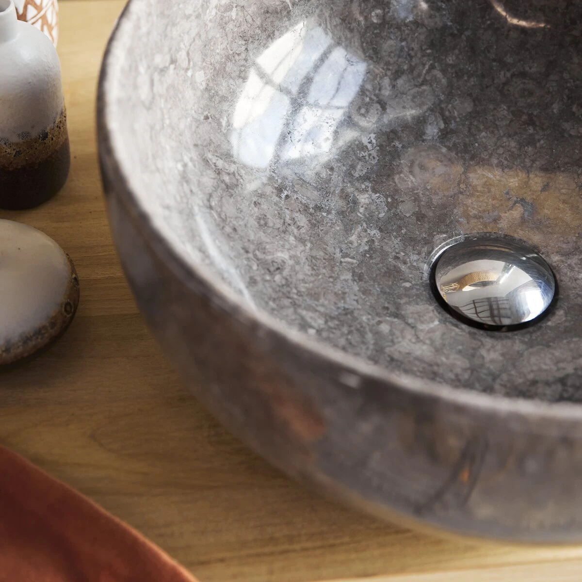 La vasque en marbre existe en marbre gris foncé.