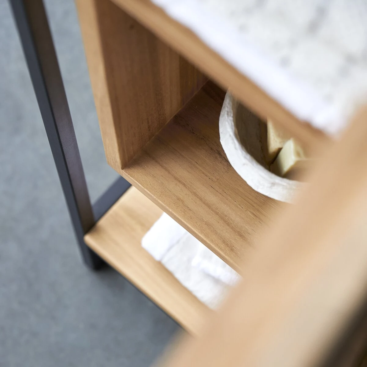 Apportez une touche contemporaine à votre salle de bain avec ce module de rangement Michal en métal et teck certifié FSC®. Son design urbain est caractérisé par ses lignes géométriques ainsi que par l’alliance du bois naturel et du métal noir pour un mariage élégant et graphique.