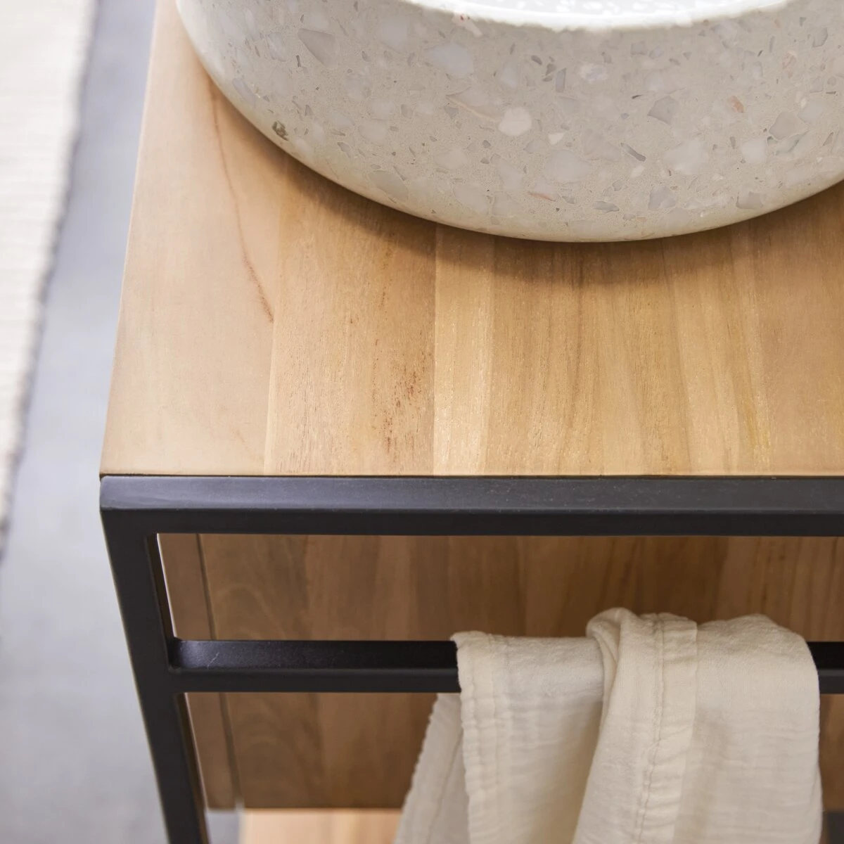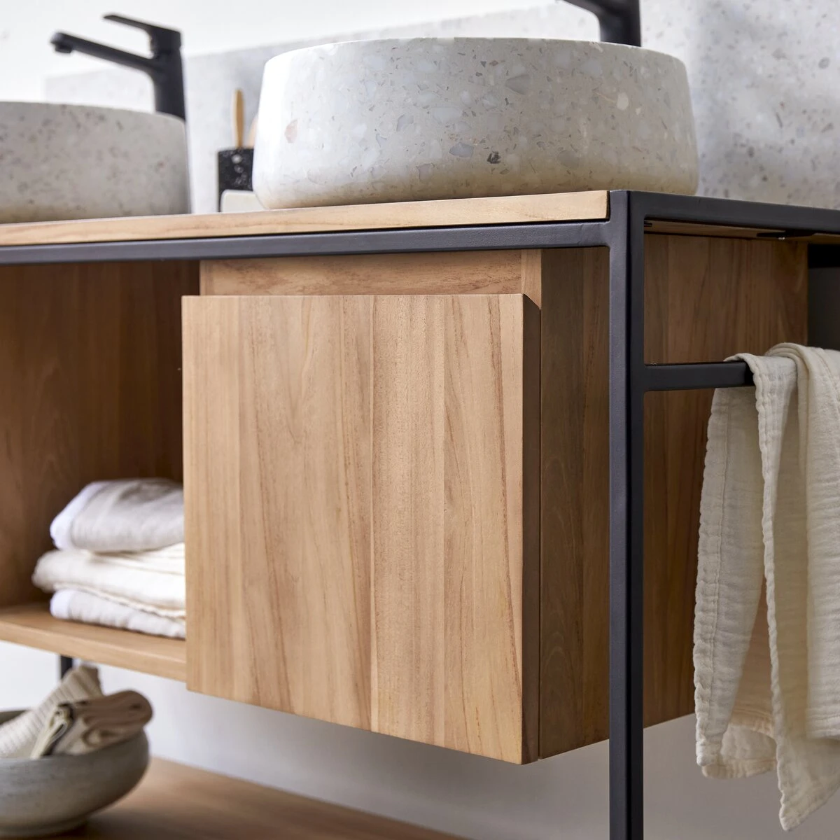 Place à l’élégance et au style dans la salle de bain … Tikamoon vous présente les meubles sous vasque Michal, l’étonnant mariage du bois de teck certifié FSC® et du métal pour un design unique et urbain. Ici, le modèle double vasques, pratique notre meuble est idéal pour l’organisation de votre salle de bain, il est équipé de multiples espaces de rangement dans lesquels vous pourrez disposer le linge de toute votre famille ainsi que vos produits de soin. Grâce à son plateau conçu pour deux vasques, vous pourrez dorénavant vous préparez à deux, exit les batailles du matin pour une place dans la salle de bain.