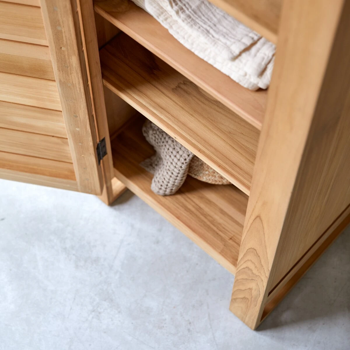 Cette colonne fait partie de la collection en teck MINIMALYS, une ligne aux douces nuances miel, travaillée dans un teck massif latté naturel pour des meubles fonctionnels, design et durables.