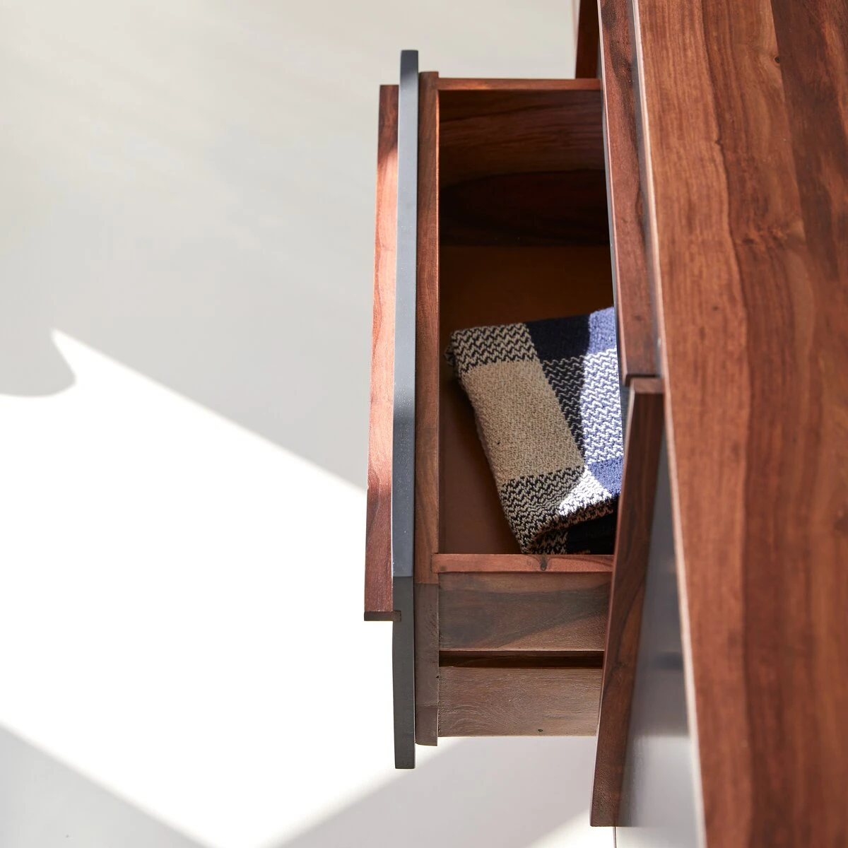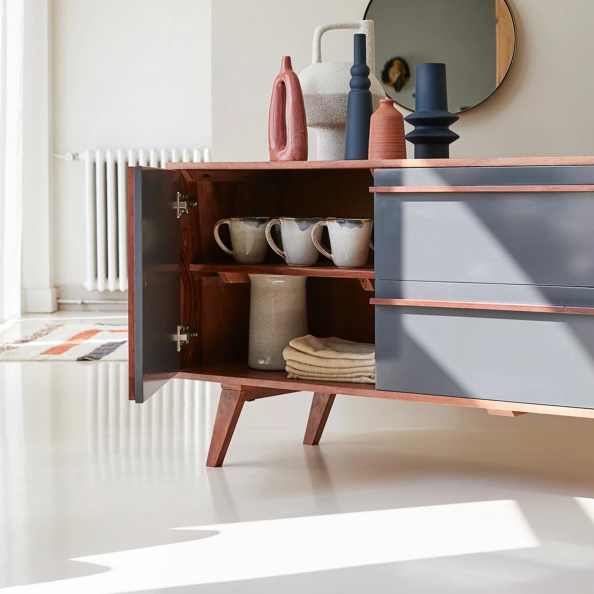 Ce buffet TV en palissandre monté sur des pieds obliques, est muni de multiples espaces pour y ranger toutes votre vaisselle et linge de table.