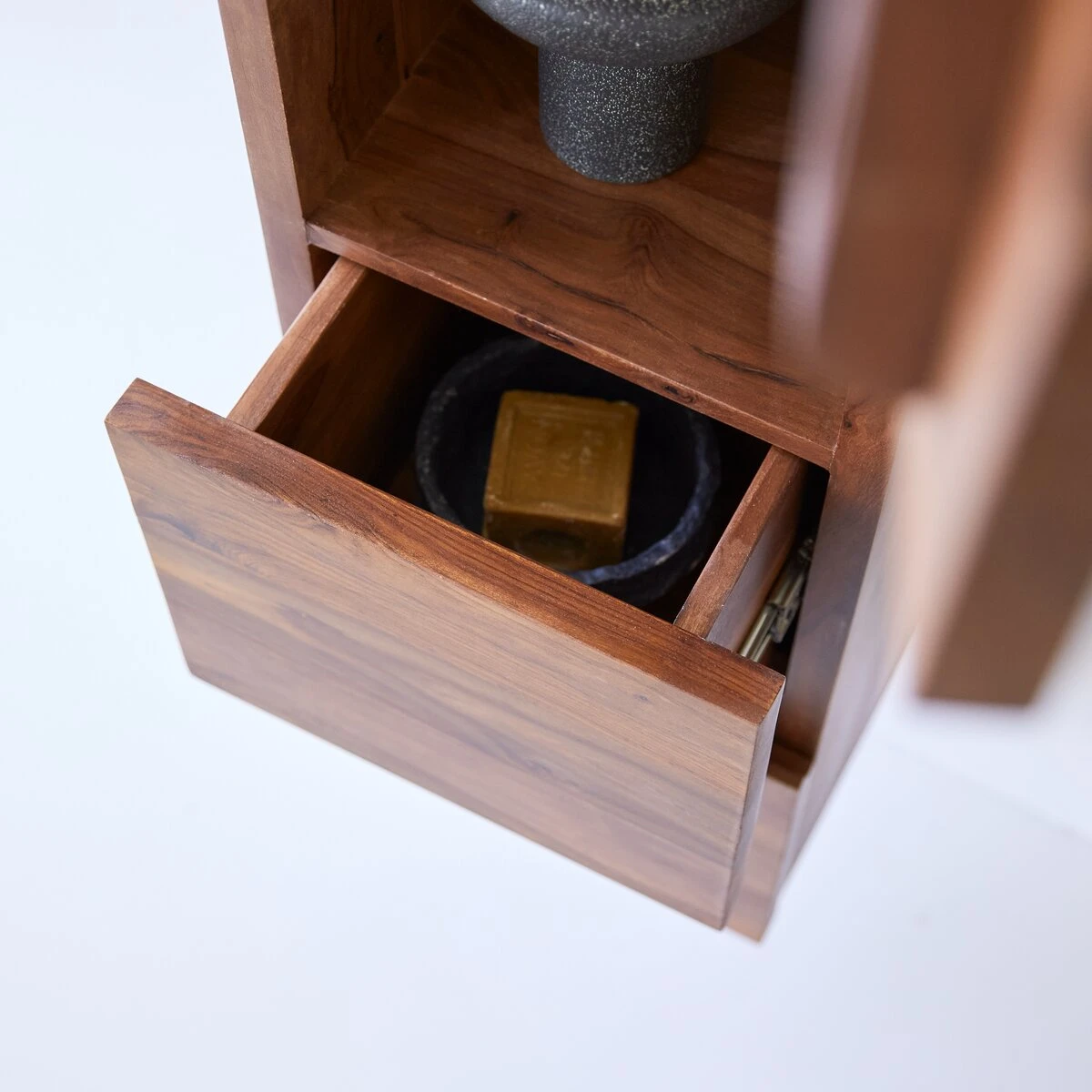 Très pratique, elle offre deux larges tiroirs pour ranger tous les produits de toilette, un compartiment pour les serviettes et une niche, idéale pour poser une plante ou un peu de déco…