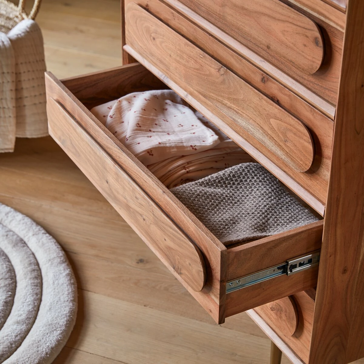 Contrairement à ce qu’imaginent les enfants en entendant le nom de ce très beau meuble, le chiffonnier en acacia massif Olga ne sert pas à ranger des chiffons mais bien à leur permettre de comprendre les notions de rangement et d’organisation. Rien n’interdit qu’ils jouent aussi aux détectives à la recherche d’objets perdus ou aux explorateurs à la poursuite du trésor des Incas. Et comme ce meuble semble planté sur ses 4 pieds, pourquoi ne pas imaginer qu’il vit au-dessus de l’eau… Rêver, jouer, explorer : c’est ça qui fait grandir !