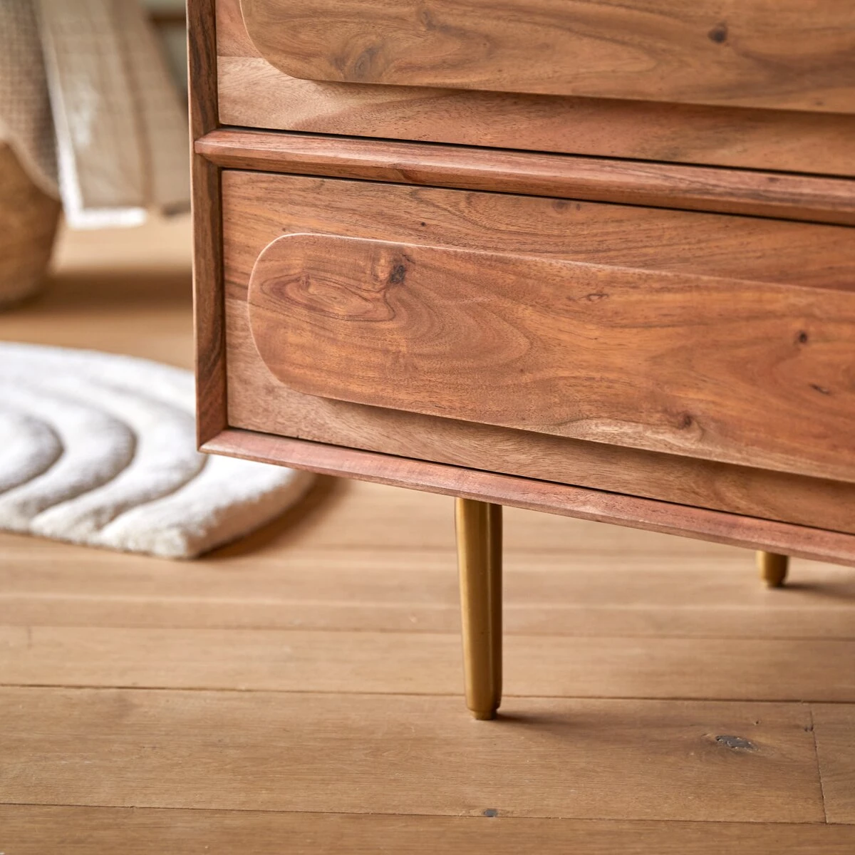 Les parents le choisiront pour son design raffiné, ses tonalités mordorées rehaussées de veines apparentes du plus bel effet et ses finitions racées : les piètements dorés et les découpes sur chacun des tiroirs.
