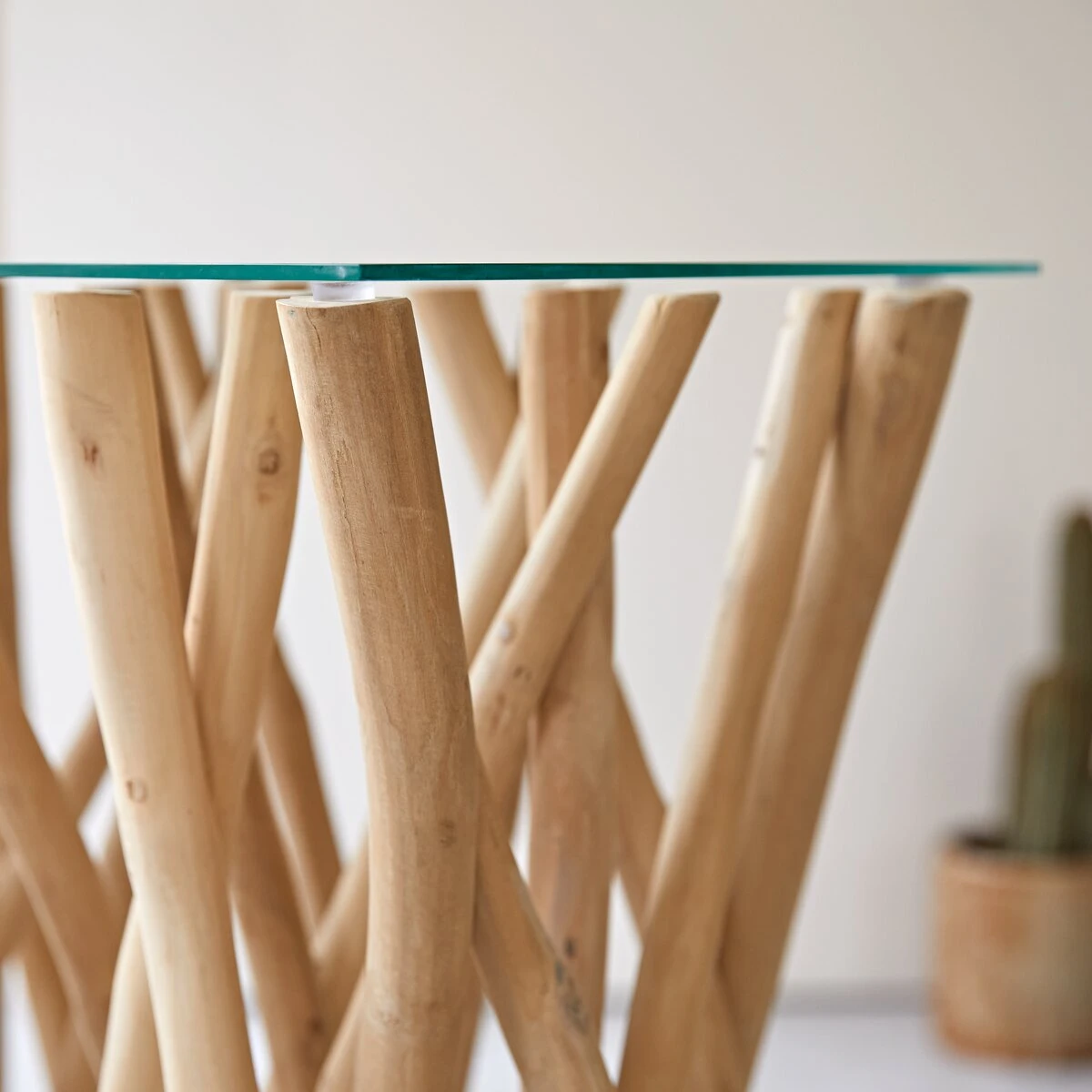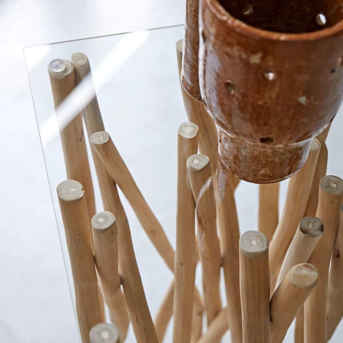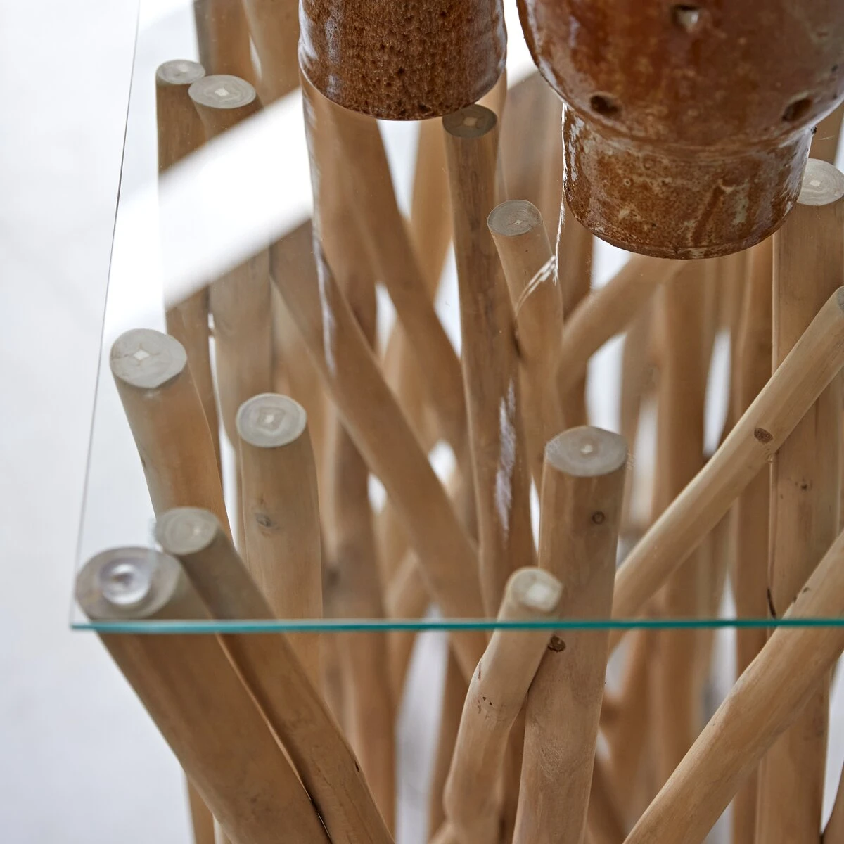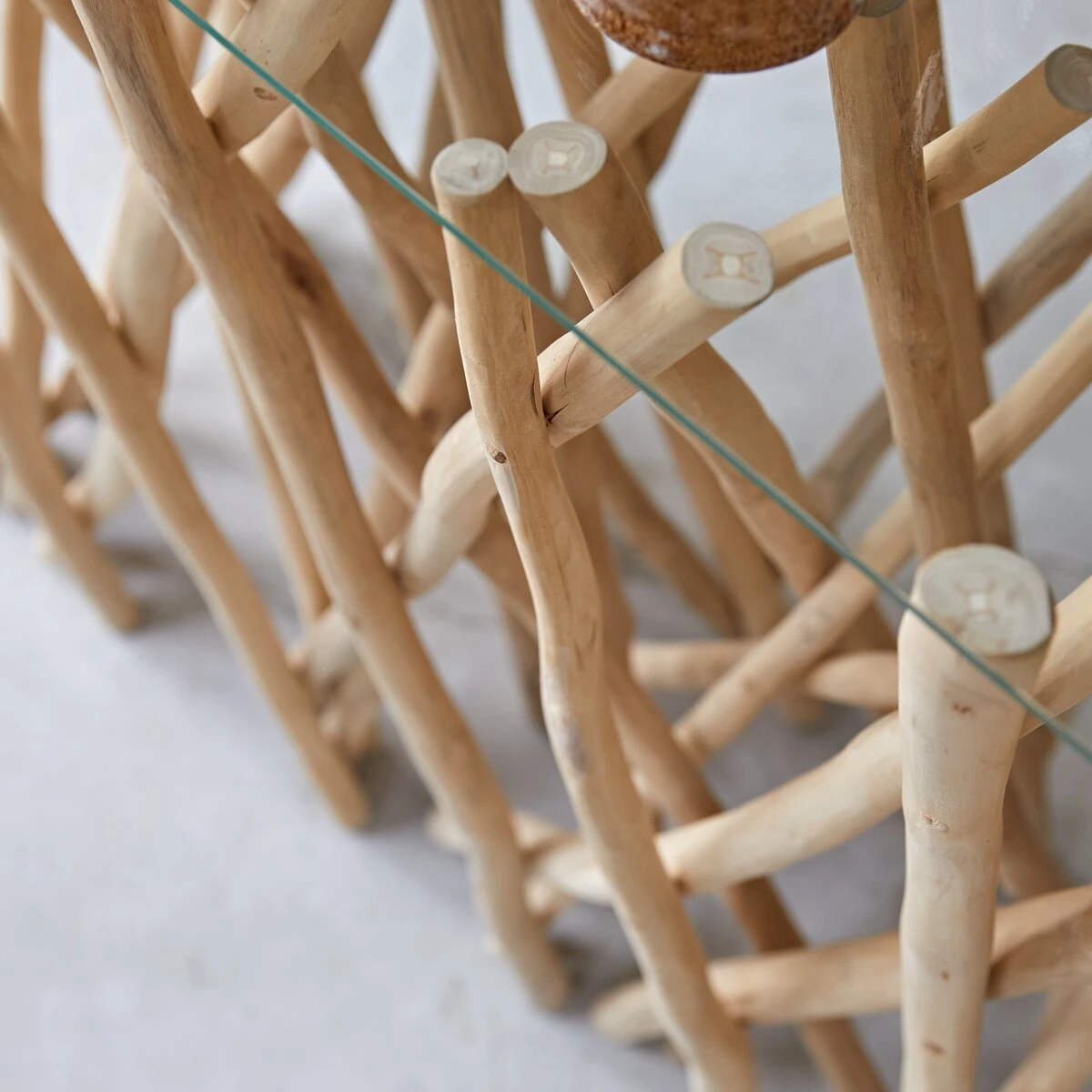 Chaleur et douceur s’invitent dans votre entrée ! Vous serez charmés par cette console au pied original constitué de branchages de teck massif. Surmontée d’un plateau en verre, elle apportera légèreté à votre intérieur.