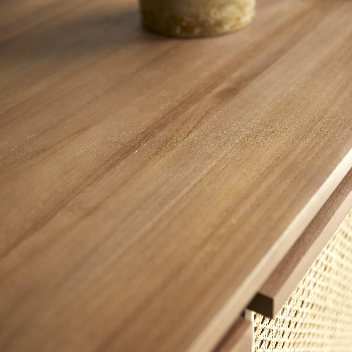 Le cannage, désormais présent dans nos intérieurs contemporains, ne cesse de se réinventer : le bahut en teck massif Roots en propose une version moderne en l’associant à un bois foncé… la blondeur de l’un rehausse l’intensité de l’autre.