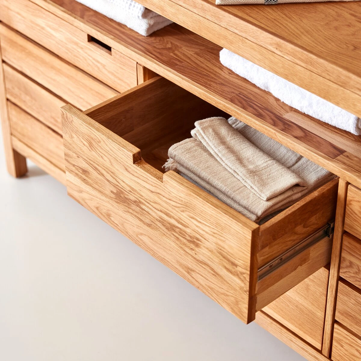Le meuble Serena est réalisé en chêne massif brossé et huilé.