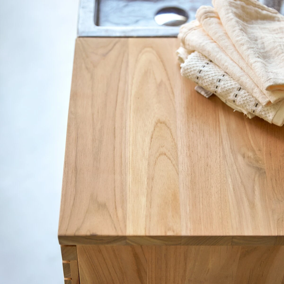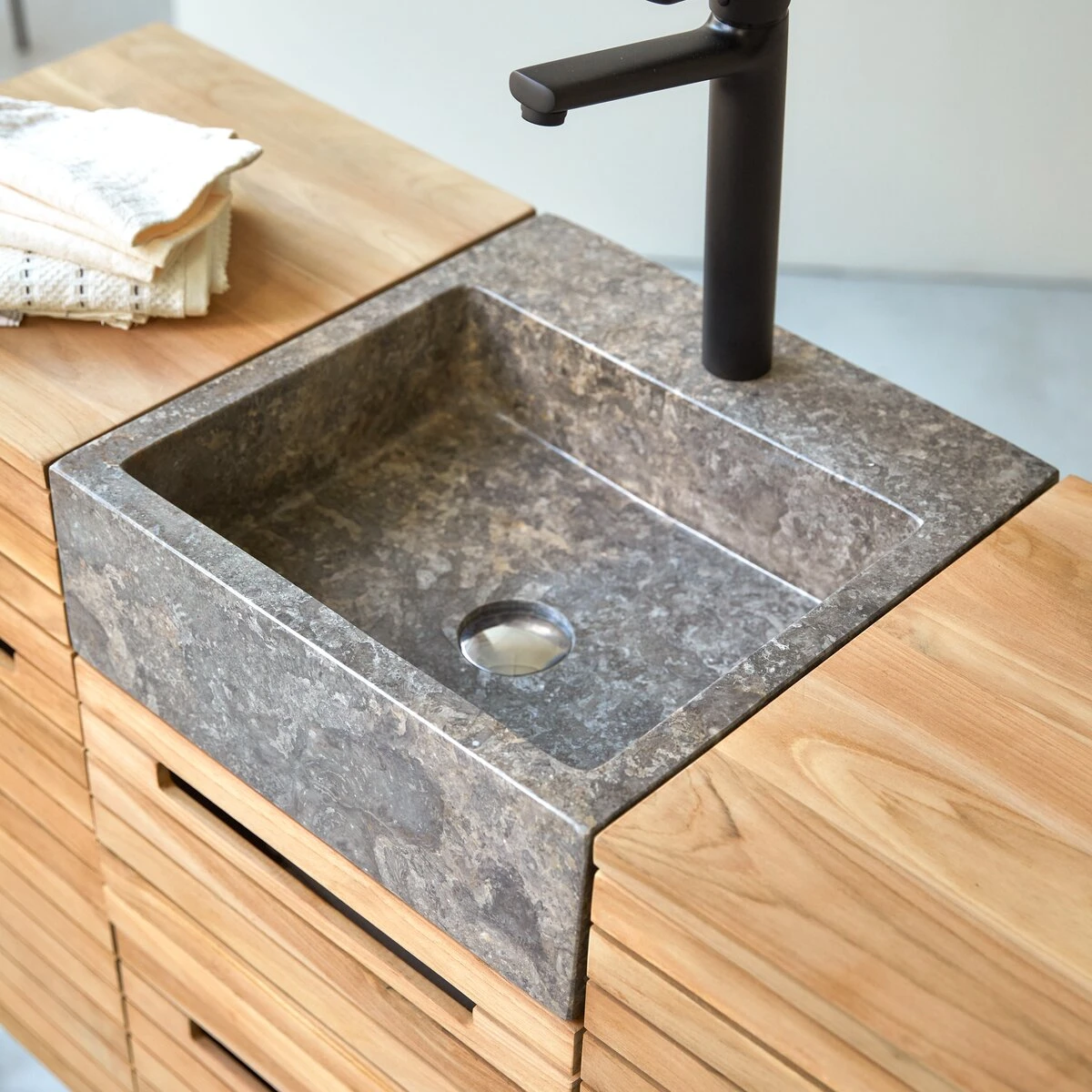 Un design trĂšs tendance, lâĂ©lĂ©gance naturelle du teck massif impermĂ©able toujours dâactualitĂ© et le raffinement du marbre : le meuble en teck et vasque en marbre Slats 122 a vraiment tout les atouts dâun meuble dĂ©diĂ© Ă un espace de dĂ©tente !