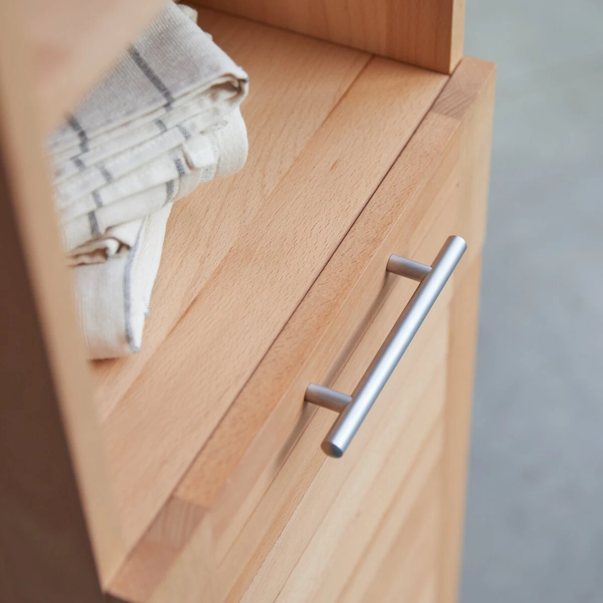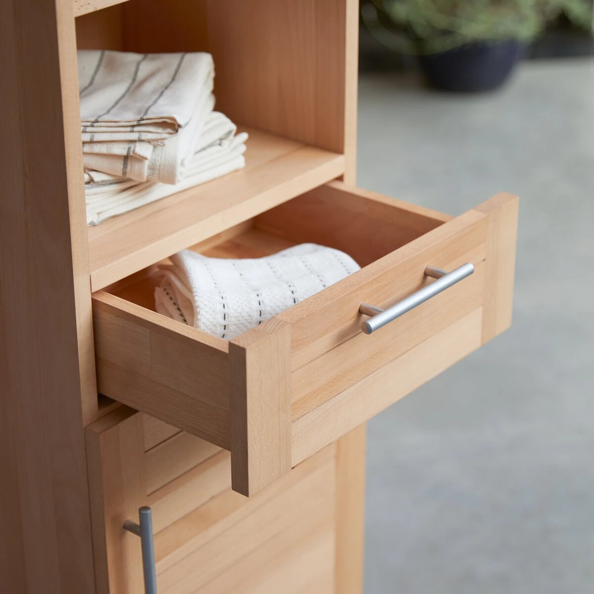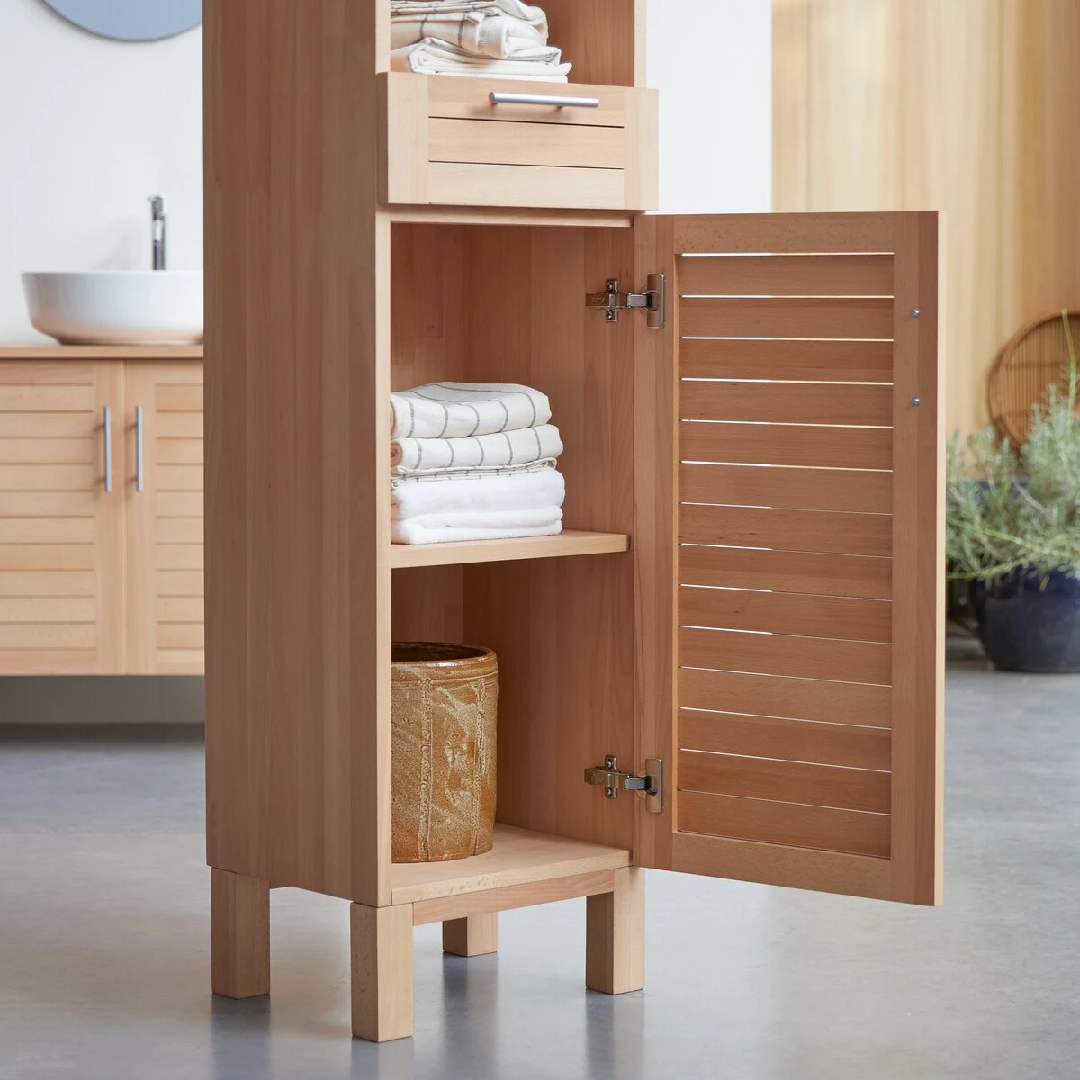 La colonne en hêtre massif Soho : légère en encombrement et bien conçue en termes de capacité de rangement ! Dans les niches, on place ce qu’on aime avoir sous les yeux, dans les étagères fermées par une porte, le linge de toilette… et dans le tiroir tous les petits accessoires qu’on ne veut pas voir traîner dans la pièce. Idéale pour compléter les autres meubles de la collection Soho, la colonne en hêtre massif conjugue élégance naturelle et finition lattée, en vogue dans les intérieurs contemporains. On aime la blondeur de son bois certifié FSC® -l’assurance qu’il provient de forêts durablement gérées- qui a bénéficié d’un traitement à l’huile pour le nourrir et le protéger en profondeur.