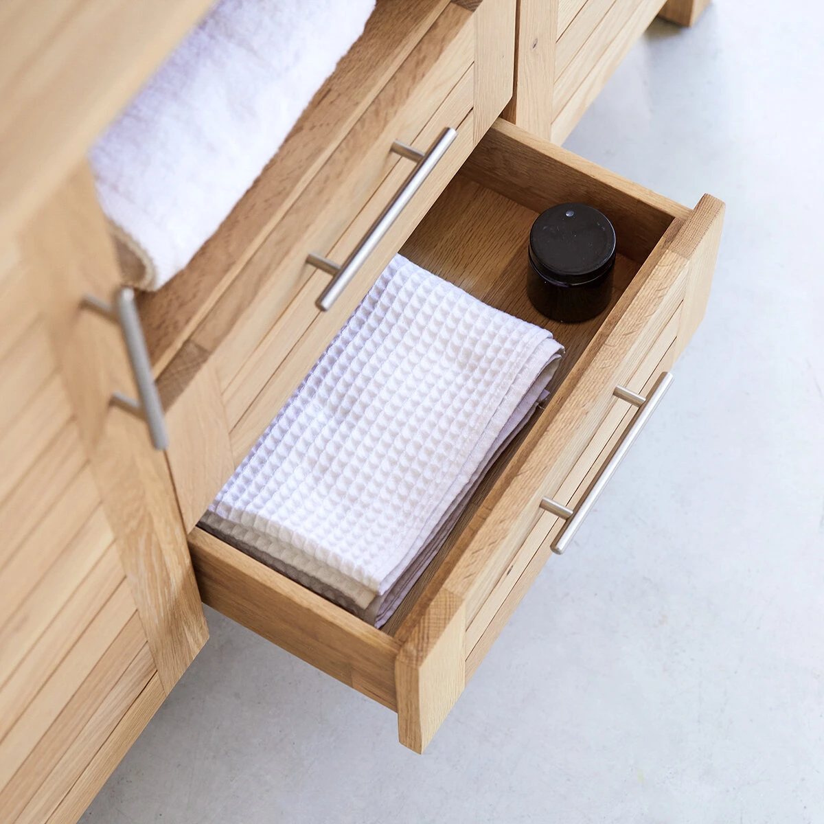 Le meuble de salle de bain en chêne massif 125 Soho : élégance intemporelle alliée à une généreuse capacité de rangement ! Vraiment pratique pour tout organiser dans la salle d’eau, il accueille le linge de toilette, les accessoires et tous les produits de beauté qu’on aime avoir à portée de main.