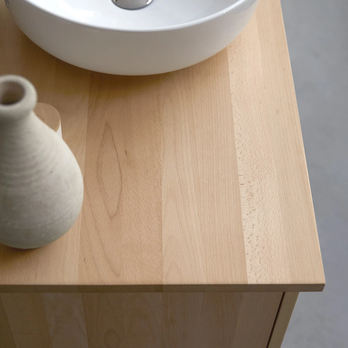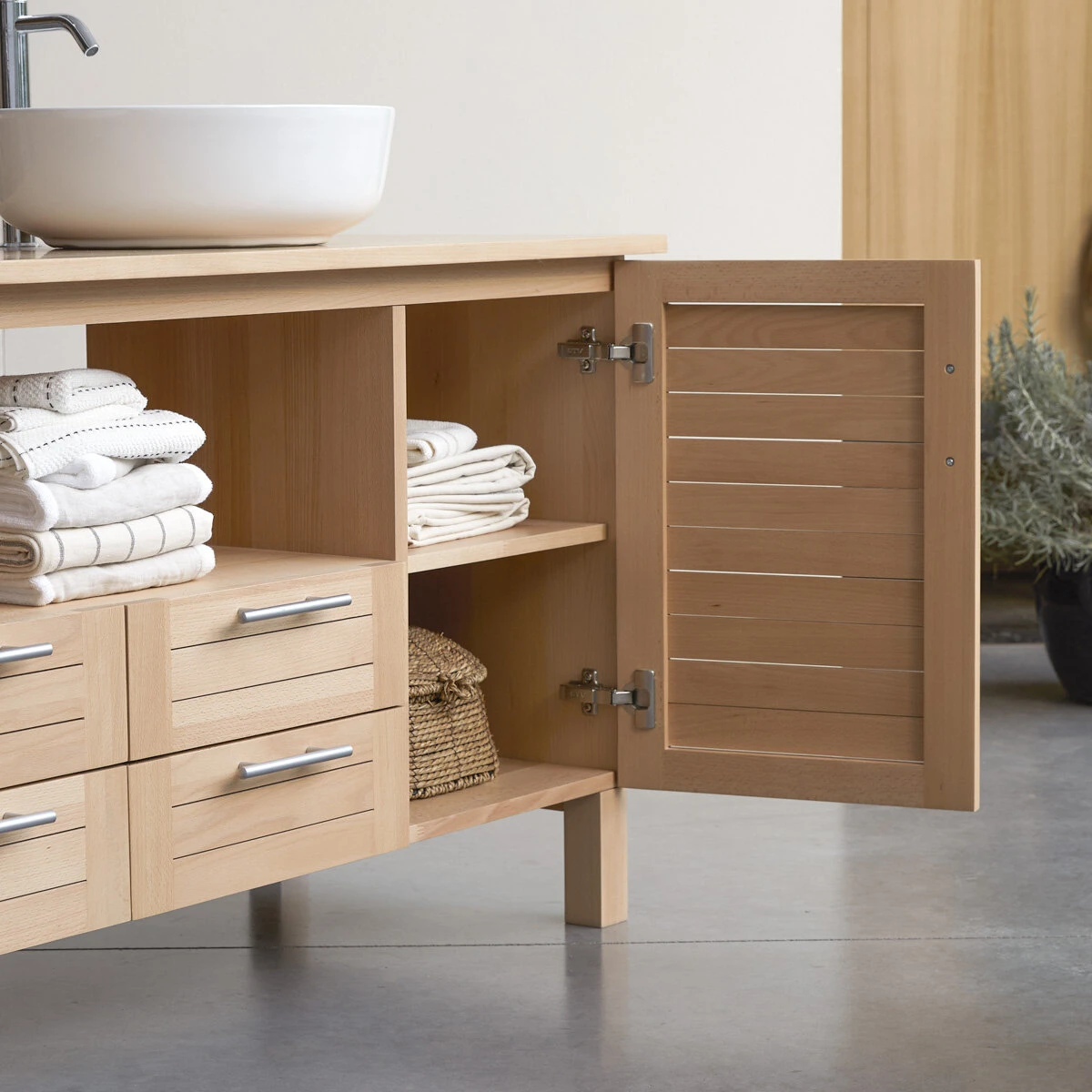 Le meuble de salle de bain en hêtre massif Soho conjugue élégance naturelle et généreuse capacité de rangement. Travaillé dans un bois clair, il est lumineux et s’adapte à toutes les déco. Bien conçu, il permet de ranger efficacement le linge de toilette, les accessoires et les produits de beauté. Parfait pour une famille, il offre un large plan qui permet de poser 2 vasques en terrazzo, en céramique ou en marbre.