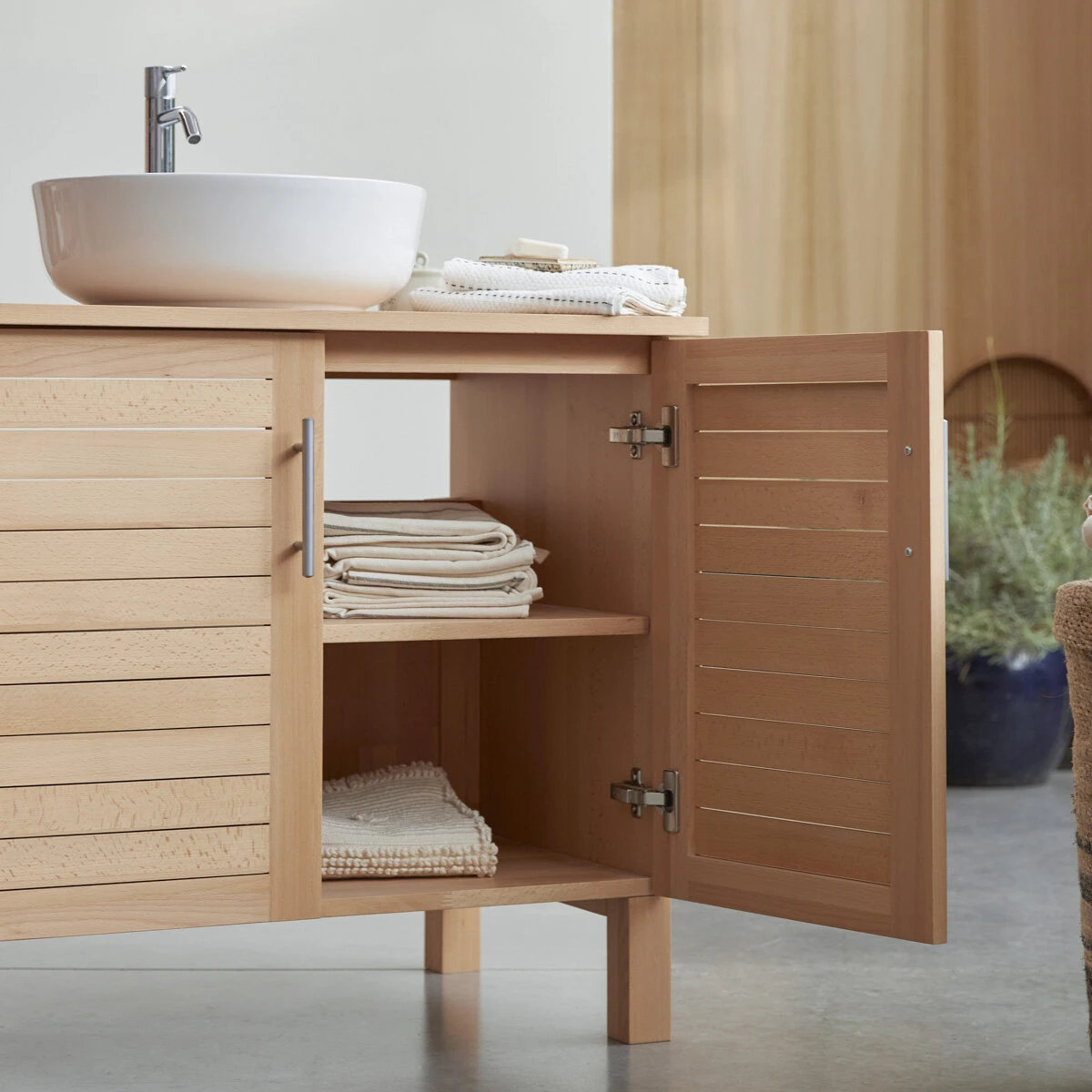 De fabrication européenne, le meuble sous vasque en hêtre massif Soho est travaillé dans un bois massif certifiénbsp; FSC® ce qui vous garantit qu’il est issu de forêts durablement gérées. Il bénéficie d’une finition huilée pour une protection en profondeur.