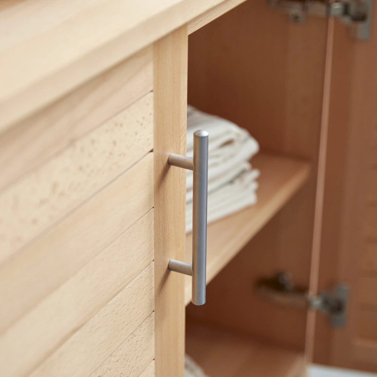 Une belle élégance de lignes et un encombrement minimum pour le meuble sous vasque en hêtre massif Soho. Idéal dans une petite salle de bain, il trouve aussi sa place dans un cabinet de toilette ou dans une chambre. Si la blondeur de son bois autorise toutes les associations de style, ce meuble se combine toutefois avec beaucoup d’à-propos à la colonne Soho en hêtre massif. Conçu pour recevoir une vasque en terrazzo, en marbre ou en céramique, il existe aussi en 165 cm et 125 cm pour habiller des salles de bain de plus grandes dimensions.
