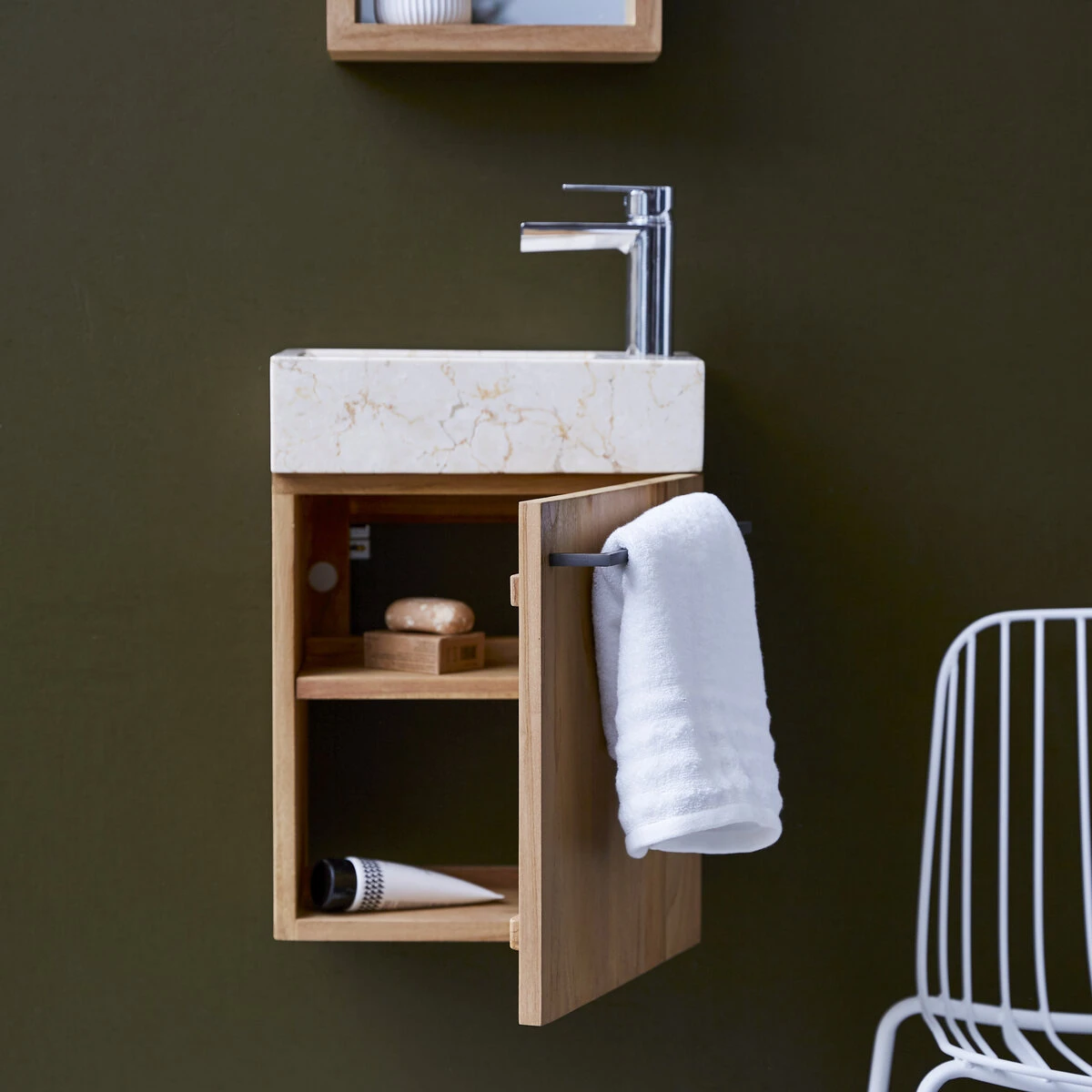 ElĂ©gance intemporelle du marbre, chaleur du teck massif certifiĂ© FSCŸ et sobriĂ©tĂ© dâun design tout en lĂ©gĂšreté⊠le meuble lave-main en teck et marbre cream Stelle a tout pour vous sĂ©duire !