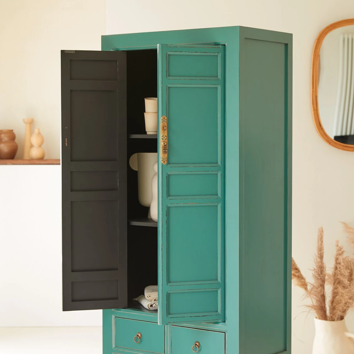 L’armoire de rangement en pin 190 Suï cultive l’envie d’horizons lointains ! On aime son allure néo ethnique pile dans l’air du temps, sa ligne effilée, sa belle capacité de rangement et ses détails qui font toute la différence : une fermeture très travaillée et des poignées en laiton, un élégant piétement, des portes à moulures et une finition laquée.