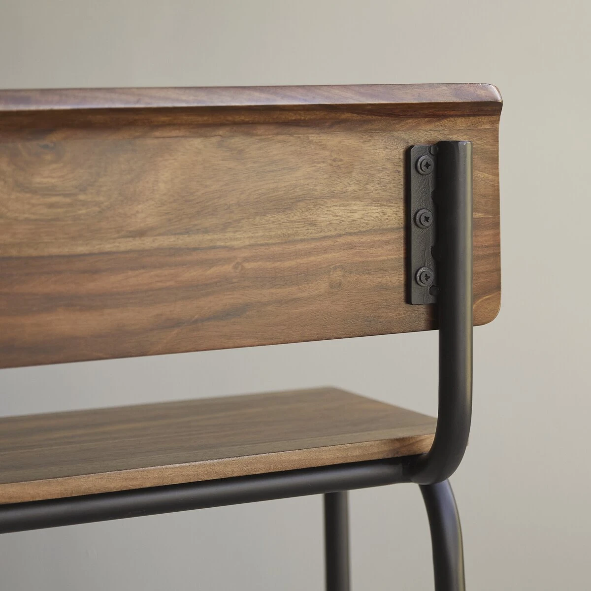 Entre banc d’atelier et souvenir de l’école élémentaire, ce banc haut en métal et palissandre massif Talia crée une belle atmosphère vintage ! On aime le contraste des matières alliant la chaleur du bois (très visuel !) à la netteté du métal.